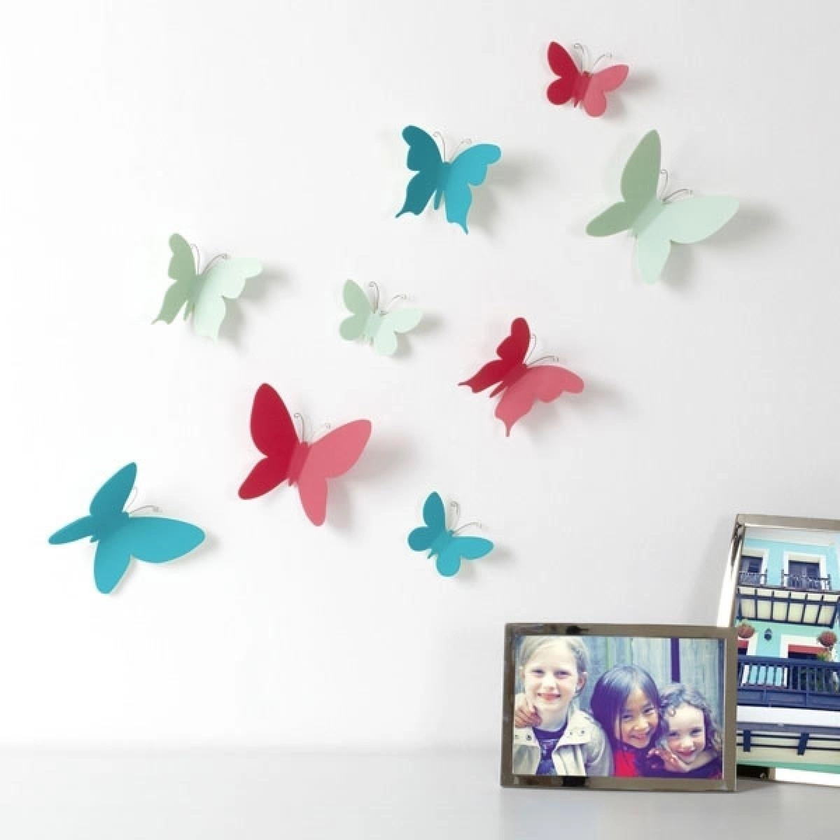Motyle montowane są do ściany za pomocą taśmy samoprzylepnej, dzięki temu można je ułożyć w dowolny sposób.