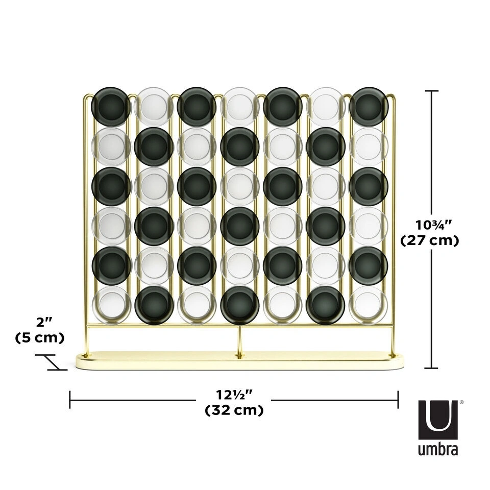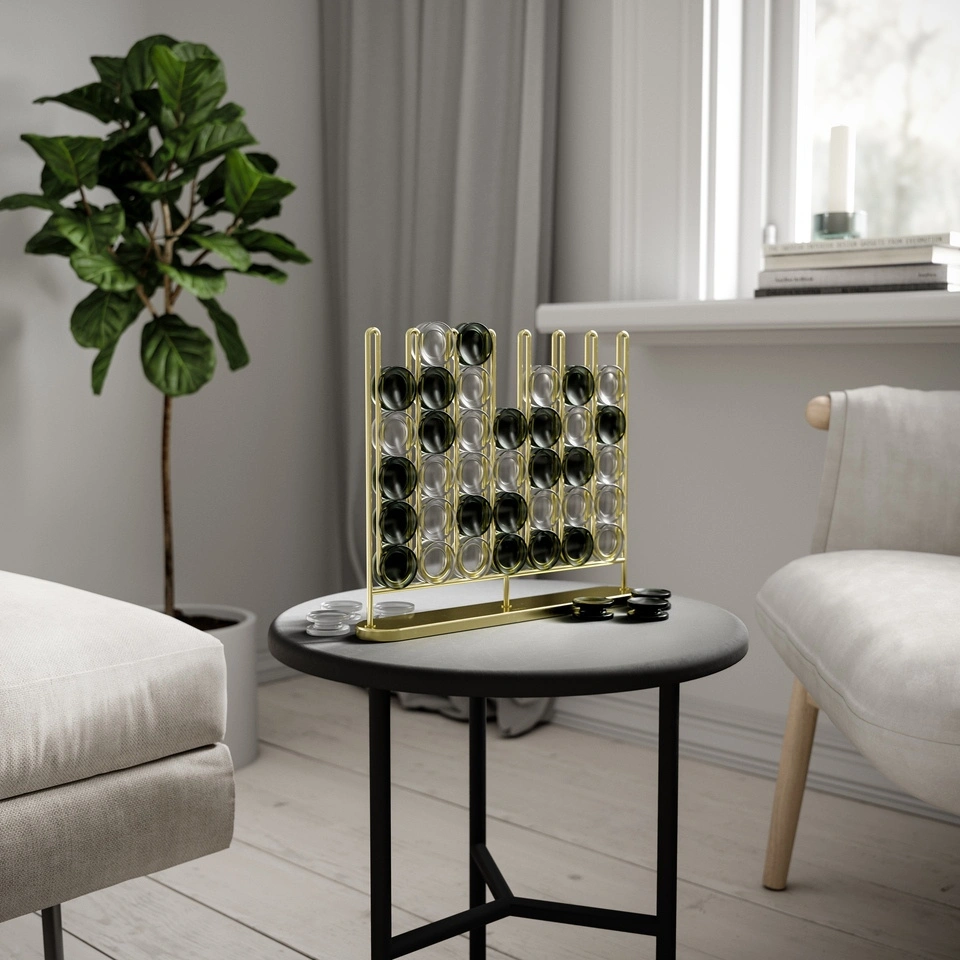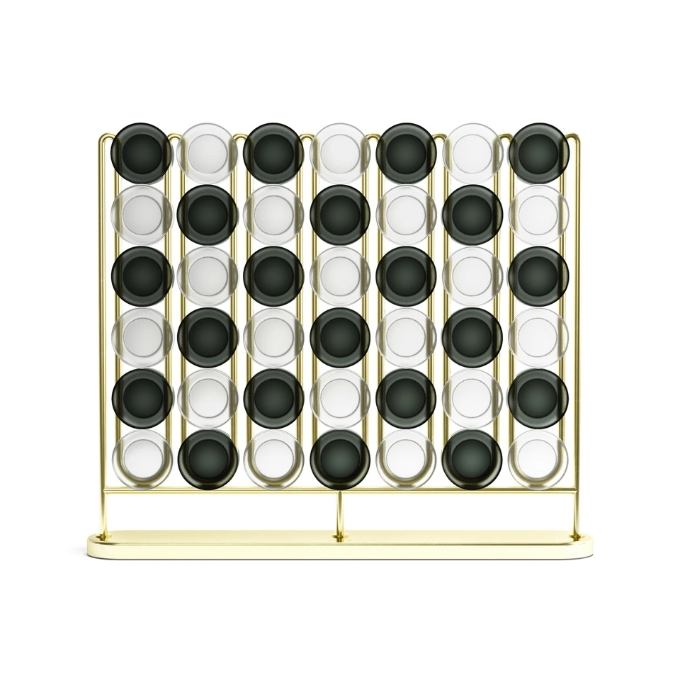 Nowoczesna wersja gry cztery w rzędzie, wyróżniająca się eleganckim, mosiężnym wykończeniem i matowymi elementami do gry.