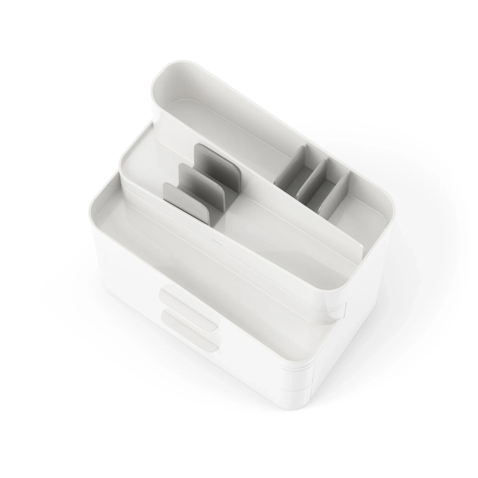 UMBRA organizer kosmetyków GLAM LARGE biały. Piękny, praktyczny organizer na przybory do makijażu, kosmetyki, codzienne produkty do pielęgnacji lub akcesoria biurowe. Dzięki przegródkom, o różnych rozmiarach i wyjmowanej wkładce, można z niego korzystać w całości lub go rozdzielić na części. Glam Large to wspaniały prezent dla Twojej drugiej połówki, przyjaciela bądź rodziny, który pozwoli na przechowywanie produktów w jednym wygodnym i zorganizowanym miejscu. Doskonale sprawdzi się na toaletce, w łazience bądź w biurze. Całość wykonano z plastiku pochodzącego z recyklingu. Waga: 1,49 kg.