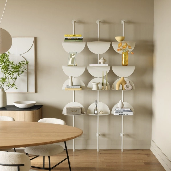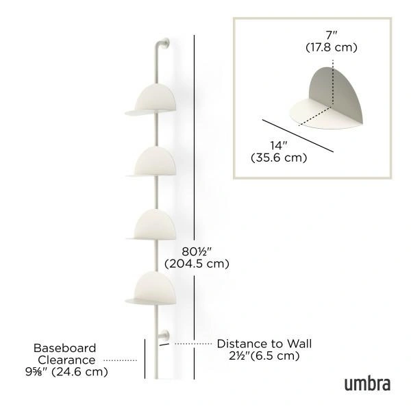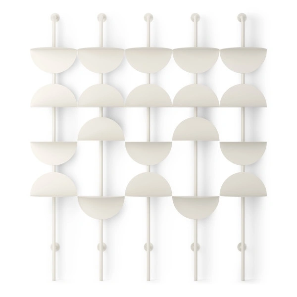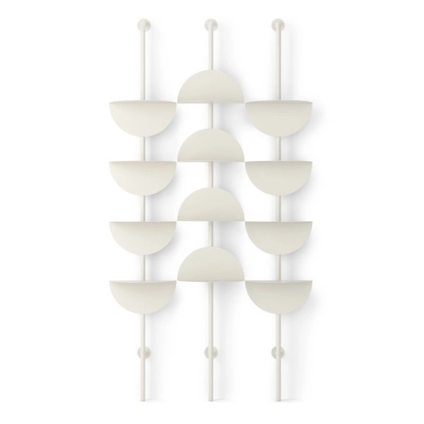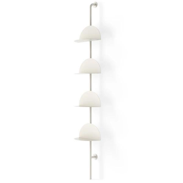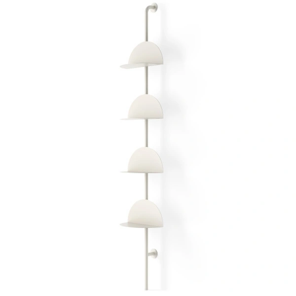 System składa się z czterech półokrągłych półek wykonanych z wytrzymałej, giętej stali, zamontowanych na smukłym, pionowym słupku.