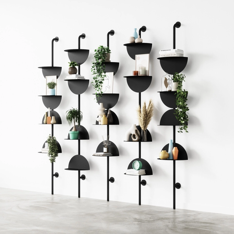 System składa się z czterech półokrągłych półek wykonanych z wytrzymałej, giętej stali, zamontowanych na smukłym, pionowym słupku.