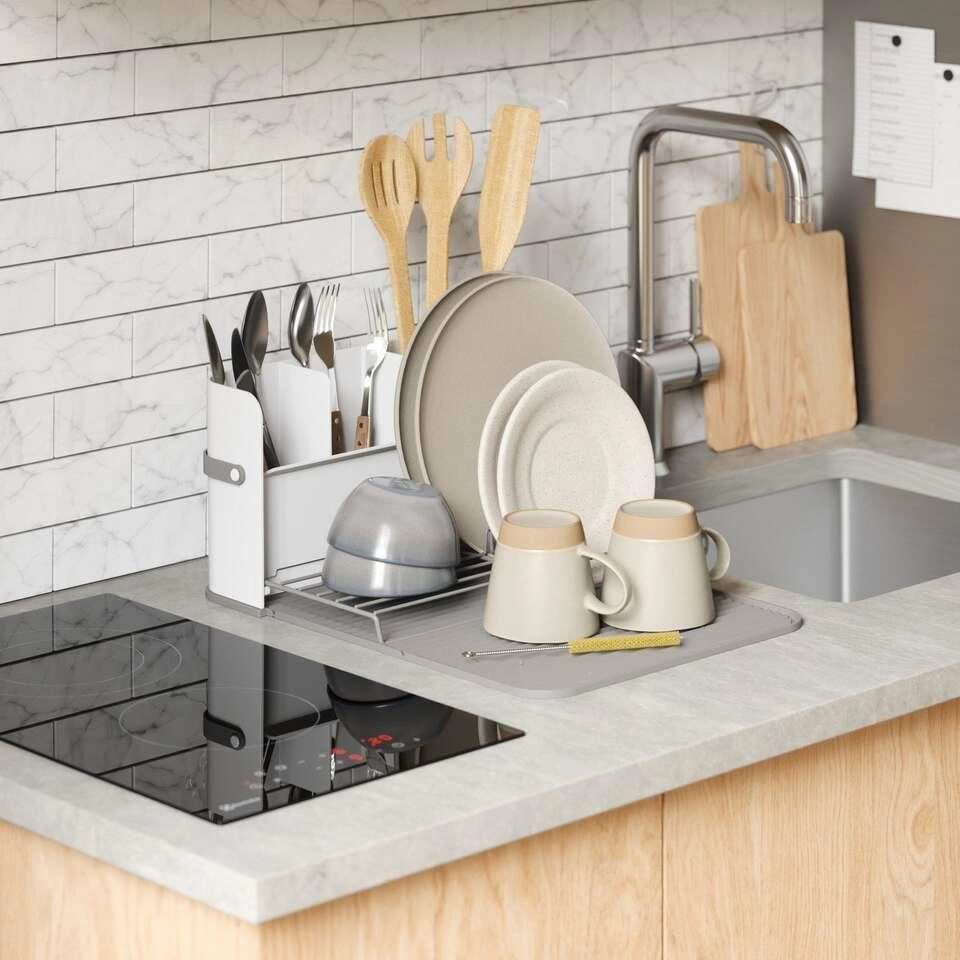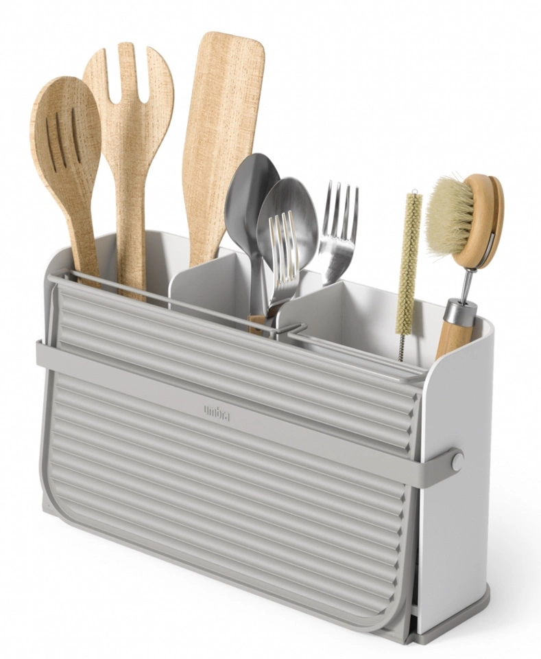 Podstawa ma trzy sekcje: na sztućce, duże przybory kuchenne oraz akcesoria do czyszczenia naczyń, takie jak gąbki i szczotki.