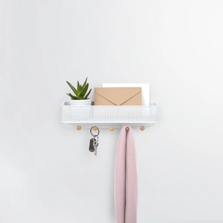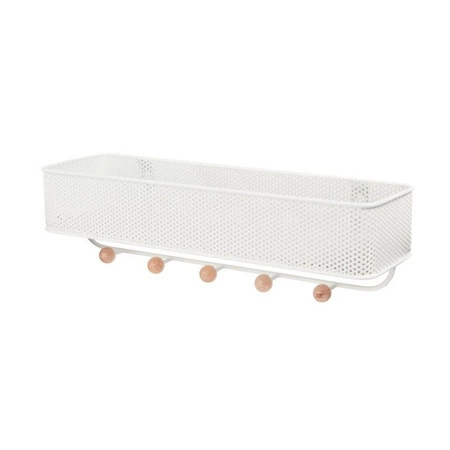 UMBRA wieszak z organizerem ESTIQUE koloru białego. Jest to metalowa półka z zamontowanym na wierzchu koszem, która w całości tworzy praktyczny wieszak. Posiada pięć haczyków zakończonych drewnianymi zdobieniami, na których możemy powiesić elementy garderoby. Wewnątrz kosza możemy umieścić najpotrzebniejsze rzeczy, takie jak portfel czy klucze. Wieszak ze wszystkimi niezbędnymi elementami potrzebnymi do montażu. Wymiary: wys. 9 cm / szer. 32 cm / gł. 9 cm Waga netto: 0,5 kg.