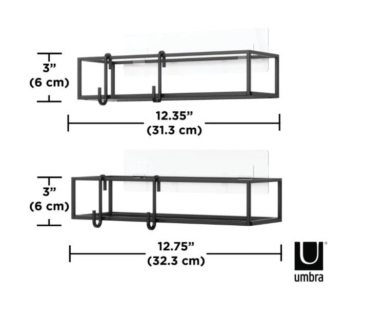 UMBRA zestaw 2 półek prysznicowych CUBIKO czarny. Uporządkuj swoje kosmetyki codziennego użytku, dzięki 2 praktycznym półkom prysznicowym Cubiko od marki Umbra. Prosta konstrukcja, nowoczesny, oryginalny design wykonany z czarnego metalu, odpornego na rdzę. Co więcej, jest łatwy w montażu, dzięki samoprzylepnym, wodoodpornym paskom, które można stosować na różnego typu ścianach jak np. płytki, sucha ściana, beton. Zestaw Cubiko polecamy jako organizer do uporządkowania kosmetyków przy wannie lub prysznicu. Wymiary: wys. 32 cm / szer. 12 cm / gł. 6 cm Waga netto: 0,86 kg Maksymalne obciążenie: do 4,5 kg.
