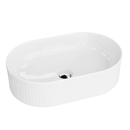 Dzięki brakowi otworu na baterię, umywalka Ilus świetnie współpracuje zarówno z wysokimi bateriami nablatowymi Orion, jak i podtynkowymi bateriami ściennymi Spark, dając pełną swobodę w aranżacji wnętrza. Delikatne lamele na powierzchni nadają jej unikalnego, designerskiego wyglądu i subtelnie podkreślają nowoczesny styl łazienki.