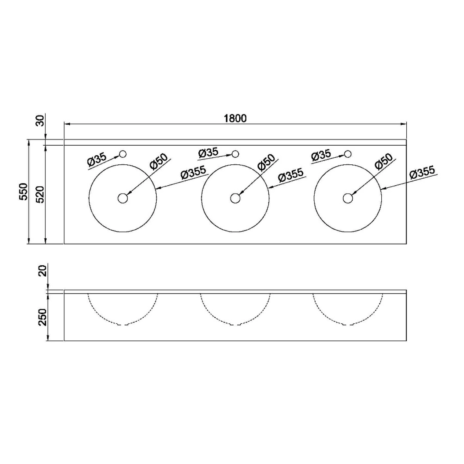 Umywalka potrójna z obudową 1800x270x550 mm, stal nierdzewna mat
