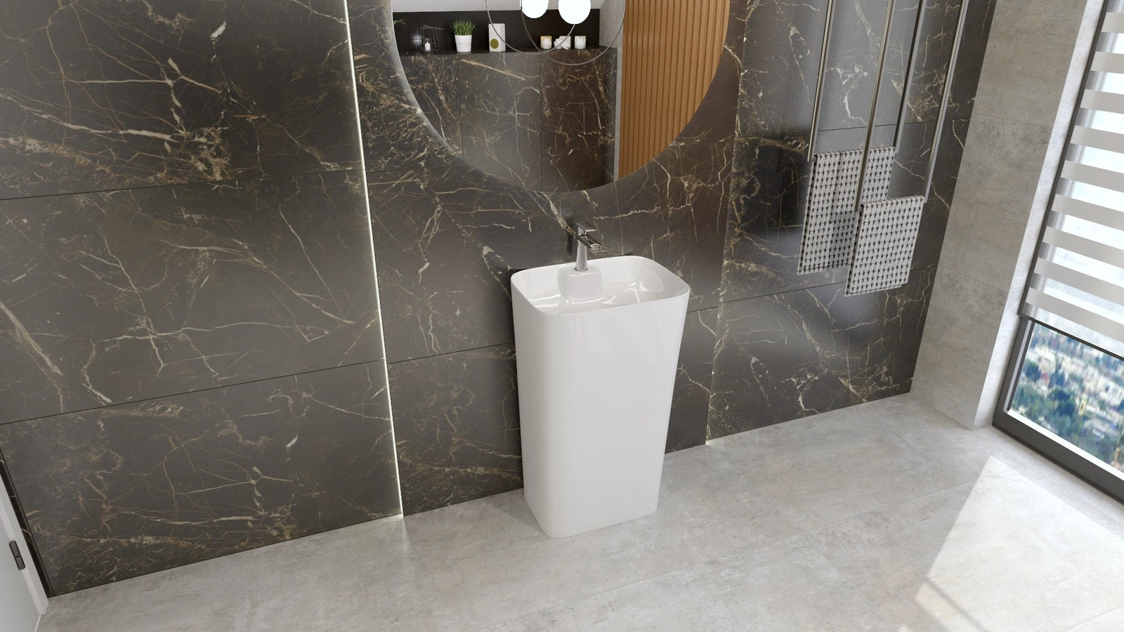 Umywalka stojąca IVA to biała bryła o konstrukcji kolumny, z subtelnie zaokrąglonymi bokami. Ten model sprawi, że wnętrze łazienki będzie prezentować się lekko i świeżo. Umywalka IVA wpisuje się w skandynawskie, eleganckie i nowoczesne aranżacje łazienek. Jeśli zależy Ci na nietuzinkowym charakterze pomieszczenia, model IVA będzie doskonałym wyborem. Dodatkowo montaż umywalki jest nieskomplikowany i nie wymaga dodatkowej zabudowy.