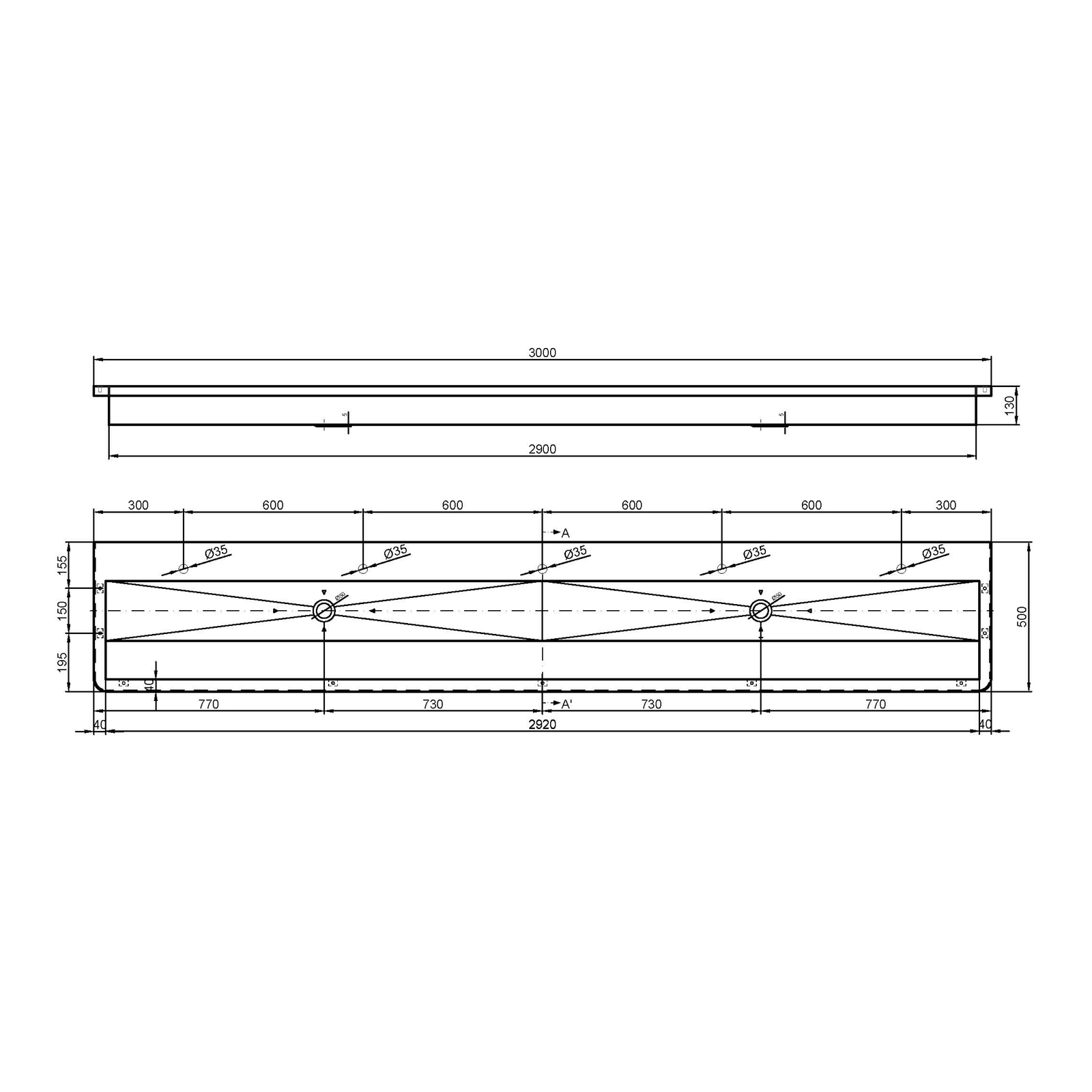 Umywalka wielostanowiskowa ścienna 3000x130x500 mm, stal nierdzewna mat