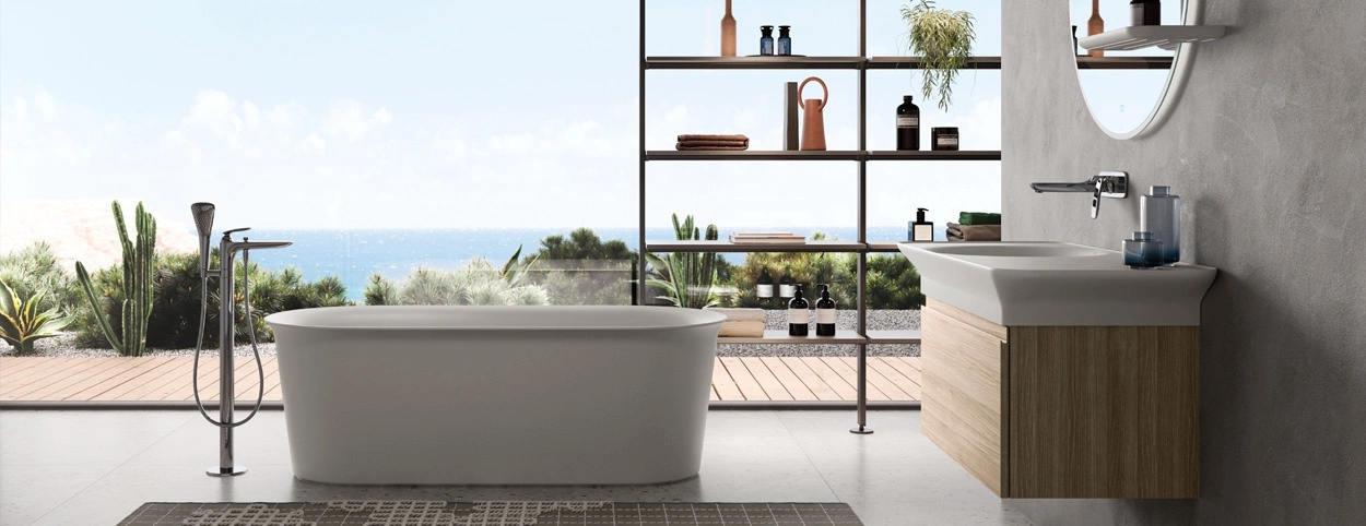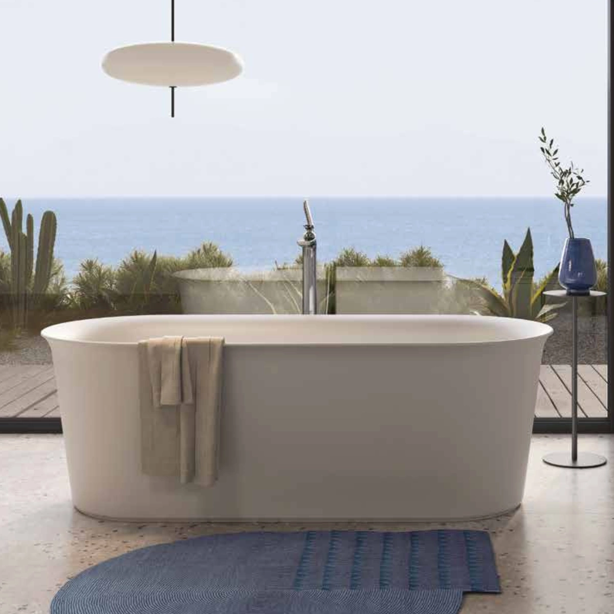 Wanny RAK-Valet wykonane są z RAKSOLID, trwałego materiału złożonego z mieszanki naturalnych minerałów i żywic. Eleganckie matowe białe wykończenie nadaje wyjątkowy charakter strefie kąpielowej, a także są przyjemne w dotyku i bardziej antypoślizgowe.