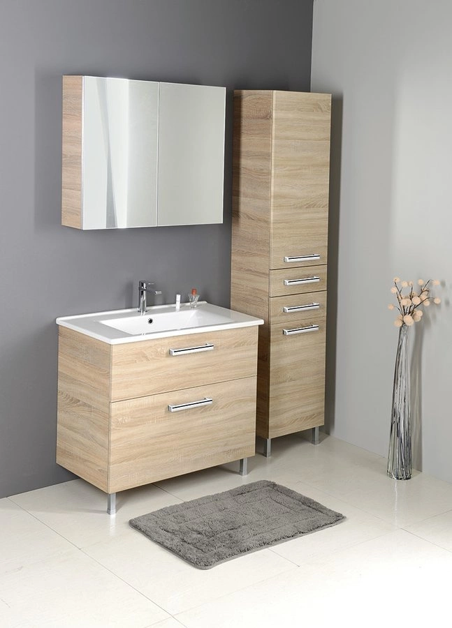 Meble łazienkowe z serii VEGA to meble nowoczesne i estetyczne w korzystnej cenie. Szafki pod umywalkę i słupki dostępne są w kolorze biały połysk lub dąb platin, wyraźny chromowy uchwyt można wymienić na czarny. Zestaw można uzupełnić efektownym blatem w kolorze dąb platin.
