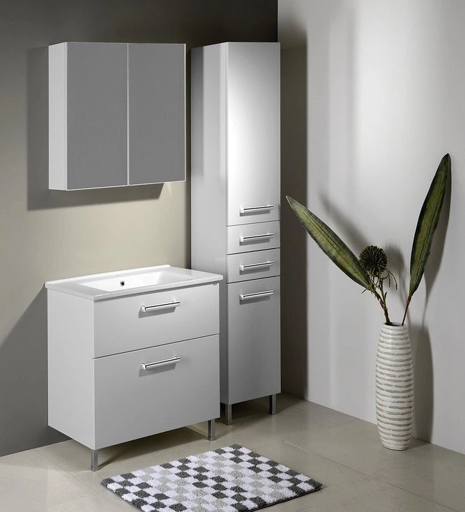Meble łazienkowe z serii VEGA to meble nowoczesne i estetyczne w korzystnej cenie. Szafki pod umywalkę i słupki dostępne są w kolorze biały połysk lub dąb platin, wyraźny chromowy uchwyt można wymienić na czarny. Zestaw można uzupełnić efektownym blatem w kolorze dąb platin.