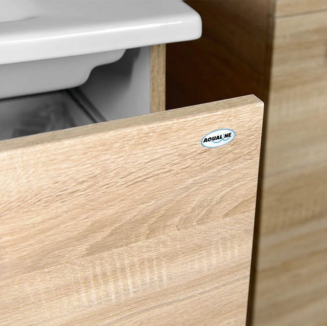 Meble łazienkowe z serii VEGA to meble nowoczesne i estetyczne w korzystnej cenie. Szafki pod umywalkę i słupki dostępne są w kolorze biały połysk lub dąb platin, wyraźny chromowy uchwyt można wymienić na czarny. Zestaw można uzupełnić efektownym blatem w kolorze dąb platin.