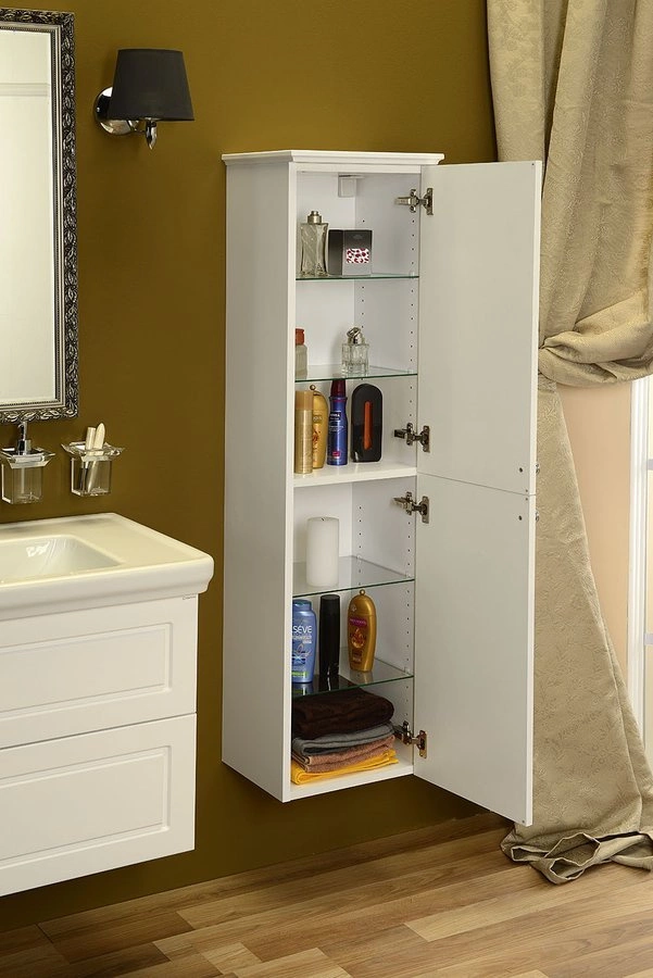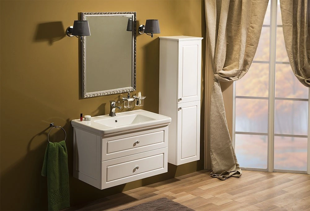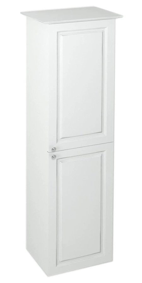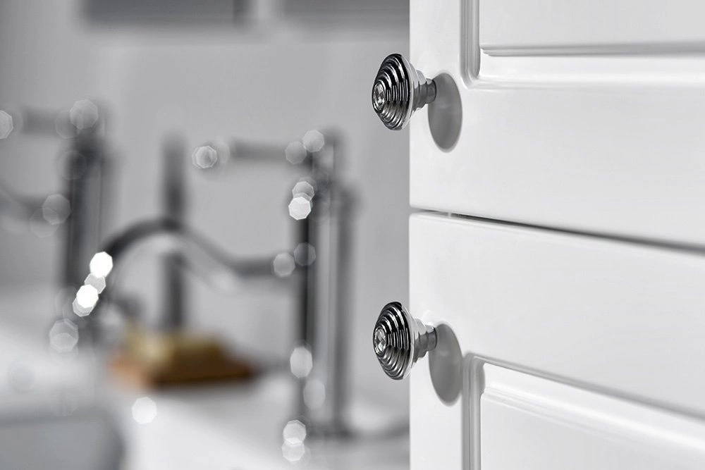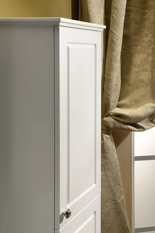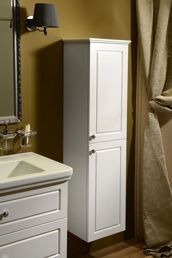 Szafki VIOLETA w stylu VINTAGE z frezowanymi frontami w kolorze biały półpołysk, uzupełnione uchwytem z kryształem SWAROVSKI doskonale podkreślą wyjątkową atmosferę twojego salonu kąpielowego.