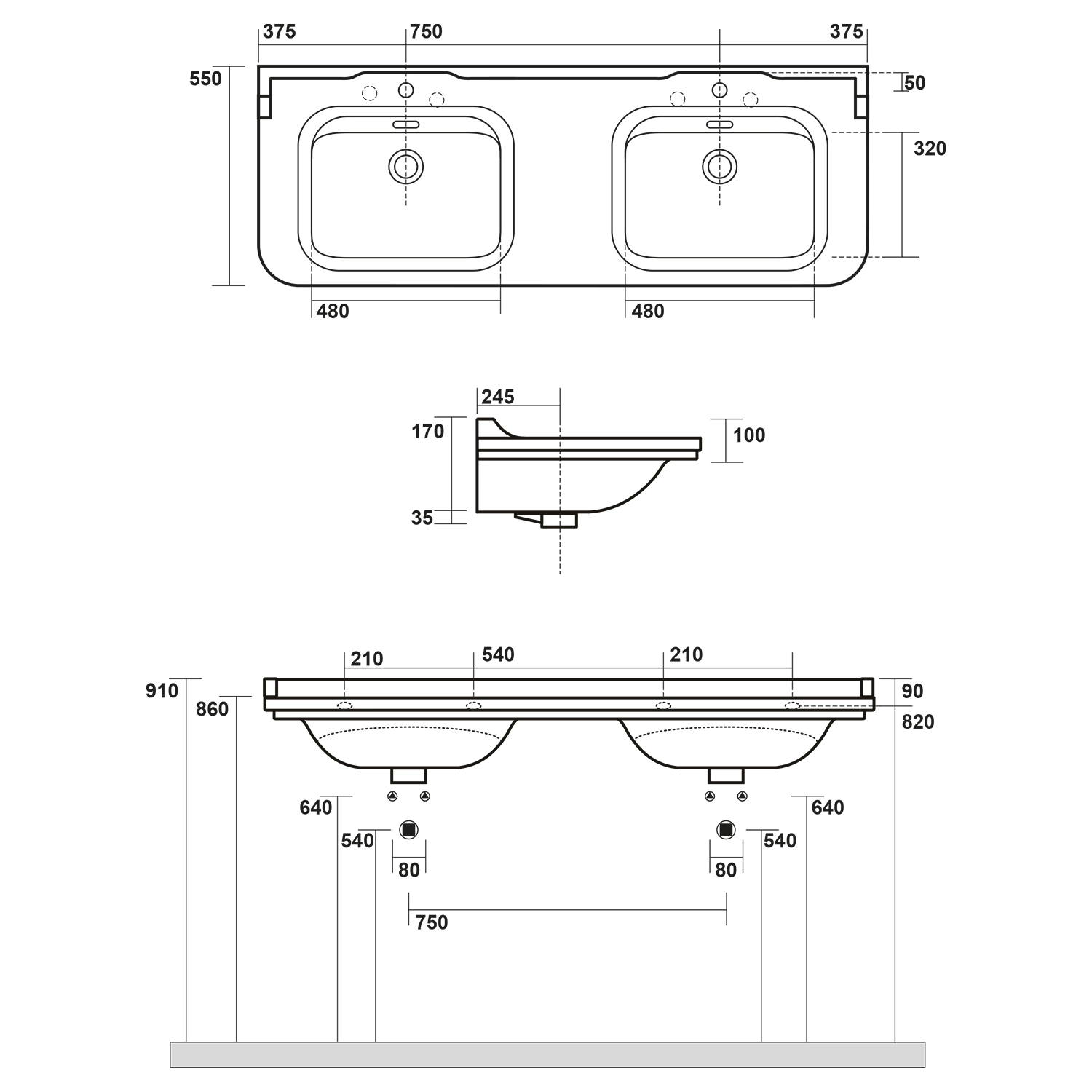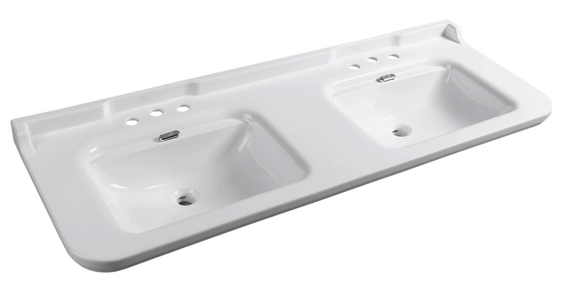WALDORF umywalka ceramiczna podwójna 150x55cm, z 3 otworami na baterię, biały
