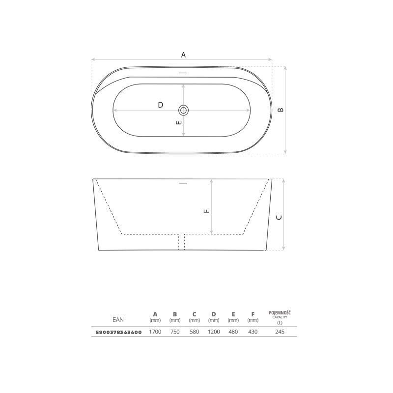 Wanna wolnostojąca Feetlux 170 cm – komfortowa kąpiel z akrylową powierzchnią, białym korkiem klik-klak i przelewem szczelinowym