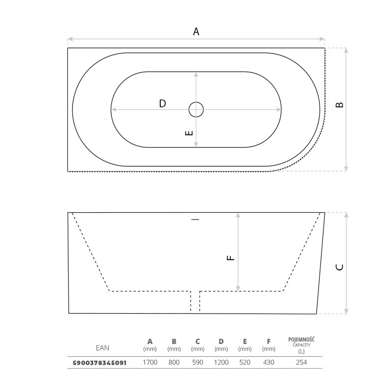 Kolor:Biały połysk:5:0, Materiał :Akryl:6:0, Przelew:Tak:16:0, Pojemność:250l:27:0, Syfon z korkiem click-clack w zestawie:Tak:28:0