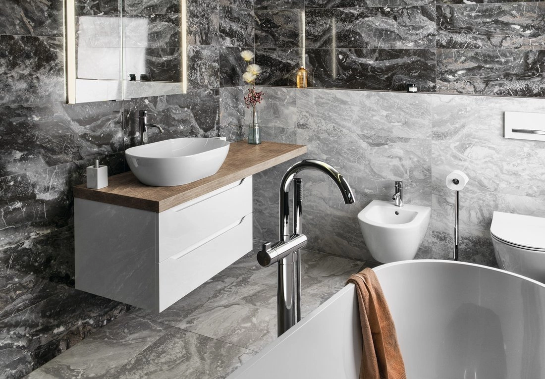 Seria mebli łazienkowych WAVE wyróżnia się ponadczasową elegancją. Elementem jednoczącym tej serii jest fala na frontach mebli, ktora pełni funkcję estetyczną i zarazem umożliwia wygodne otwieranie. Designu szafki odpowiada wyrafinowany kształt umywalki kompozytowej LUCIOLA. Szafki umywalkowe WAVE oferujemy w sześciu różnych szerokościach, także pod umywalkę podwójną. Dodatkowe wysokie słupki harmonijnie uzupełniają całość. W ofeercie znajduje się także szafka z blatem - patrz seria Kompozycja. Zgodnie z wyobraźnią możesz postawić na blacie jakąkolwiek umywalkę nablatową, którą wybierzesz z naszej bogatej oferty, tak samo jak i blat występuje w kilku rożnych dekorach.