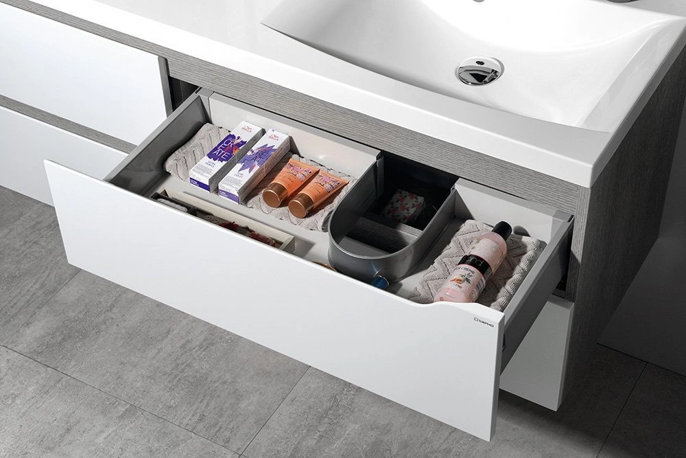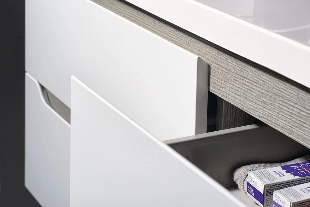 Szuflady naszych mebli wyposażone są w prowadnice z systemem powolnego i cichego domyku. Wystarczy jedno pchnięcie i szuflada domknie się sama, cicho i delikatnie.