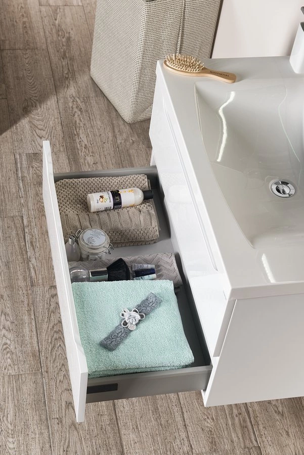 Szuflady naszych mebli wyposażone są w prowadnice z systemem powolnego i cichego domyku. Wystarczy jedno pchnięcie i szuflada domknie się sama, cicho i delikatnie.