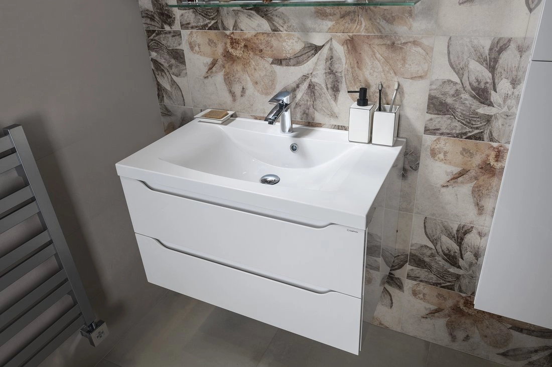 Seria mebli łazienkowych WAVE wyróżnia się ponadczasową elegancją. Elementem jednoczącym tej serii jest fala na frontach mebli, ktora pełni funkcję estetyczną i zarazem umożliwia wygodne otwieranie. Designu szafki odpowiada wyrafinowany kształt umywalki kompozytowej LUCIOLA. Szafki umywalkowe WAVE oferujemy w sześciu różnych szerokościach, także pod umywalkę podwójną. Dodatkowe wysokie słupki harmonijnie uzupełniają całość. W ofeercie znajduje się także szafka z blatem - patrz seria Kompozycja. Zgodnie z wyobraźnią możesz postawić na blacie jakąkolwiek umywalkę nablatową, którą wybierzesz z naszej bogatej oferty, tak samo jak i blat występuje w kilku rożnych dekorach.