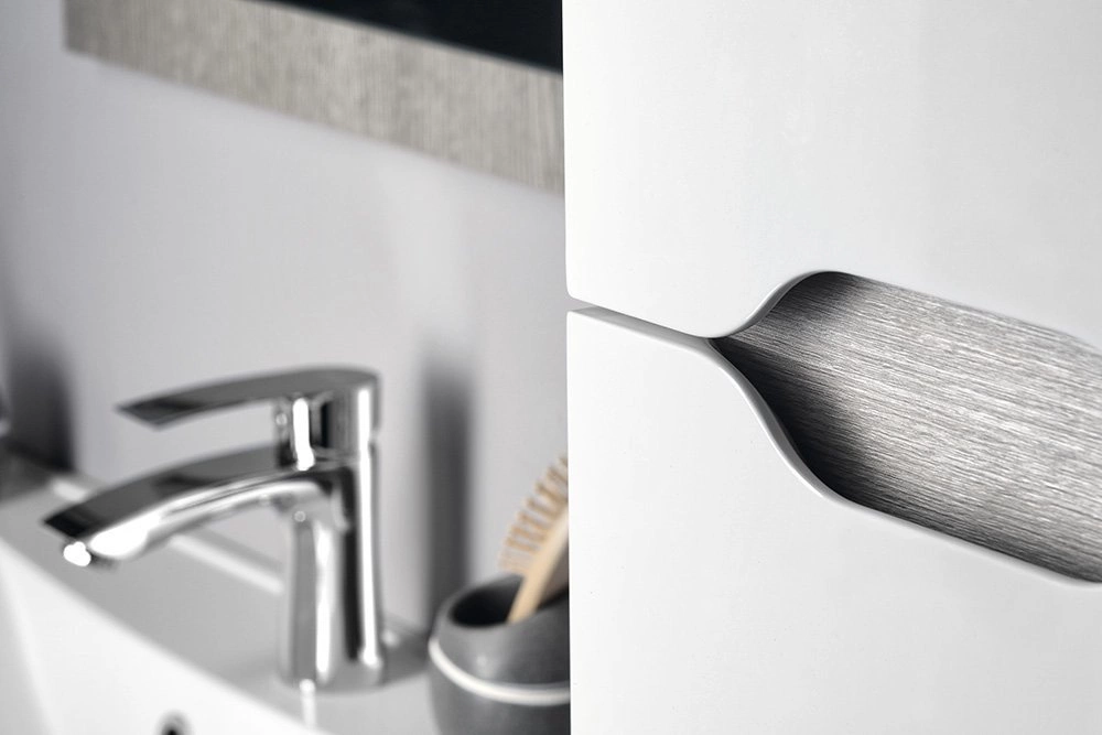 Seria mebli łazienkowych WAVE wyróżnia się ponadczasową elegancją. Elementem jednoczącym tej serii jest fala na frontach mebli, ktora pełni funkcję estetyczną i zarazem umożliwia wygodne otwieranie. Designu szafki odpowiada wyrafinowany kształt umywalki kompozytowej LUCIOLA. Szafki umywalkowe WAVE oferujemy w sześciu różnych szerokościach, także pod umywalkę podwójną. Dodatkowe wysokie słupki harmonijnie uzupełniają całość. W ofeercie znajduje się także szafka z blatem - patrz seria Kompozycja. Zgodnie z wyobraźnią możesz postawić na blacie jakąkolwiek umywalkę nablatową, którą wybierzesz z naszej bogatej oferty, tak samo jak i blat występuje w kilku rożnych dekorach.