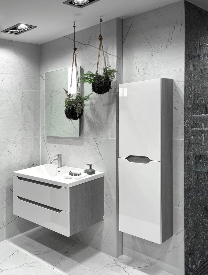 Seria mebli łazienkowych WAVE wyróżnia się ponadczasową elegancją. Elementem jednoczącym tej serii jest fala na frontach mebli, ktora pełni funkcję estetyczną i zarazem umożliwia wygodne otwieranie. Designu szafki odpowiada wyrafinowany kształt umywalki kompozytowej LUCIOLA. Szafki umywalkowe WAVE oferujemy w sześciu różnych szerokościach, także pod umywalkę podwójną. Dodatkowe wysokie słupki harmonijnie uzupełniają całość. W ofeercie znajduje się także szafka z blatem - patrz seria Kompozycja. Zgodnie z wyobraźnią możesz postawić na blacie jakąkolwiek umywalkę nablatową, którą wybierzesz z naszej bogatej oferty, tak samo jak i blat występuje w kilku rożnych dekorach.