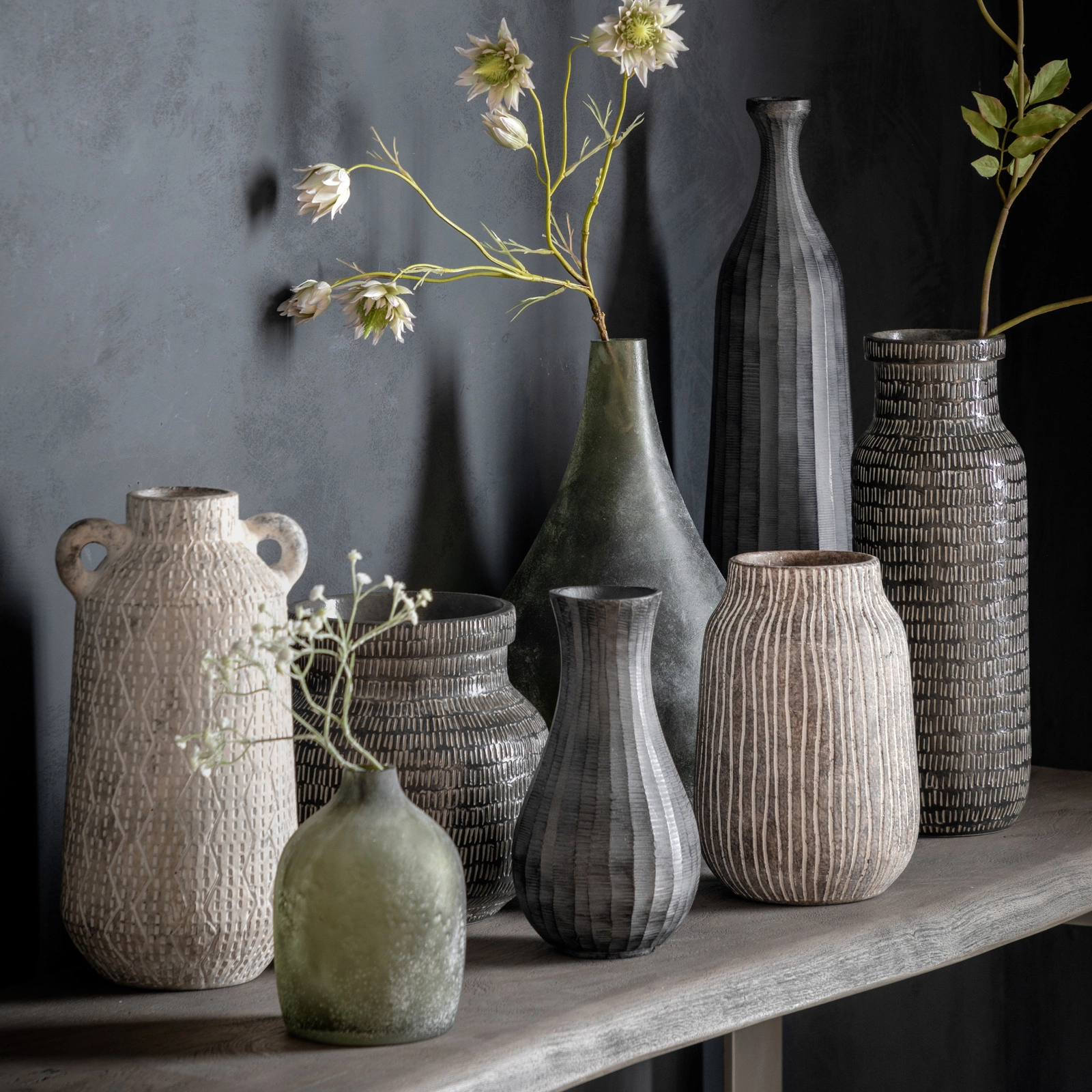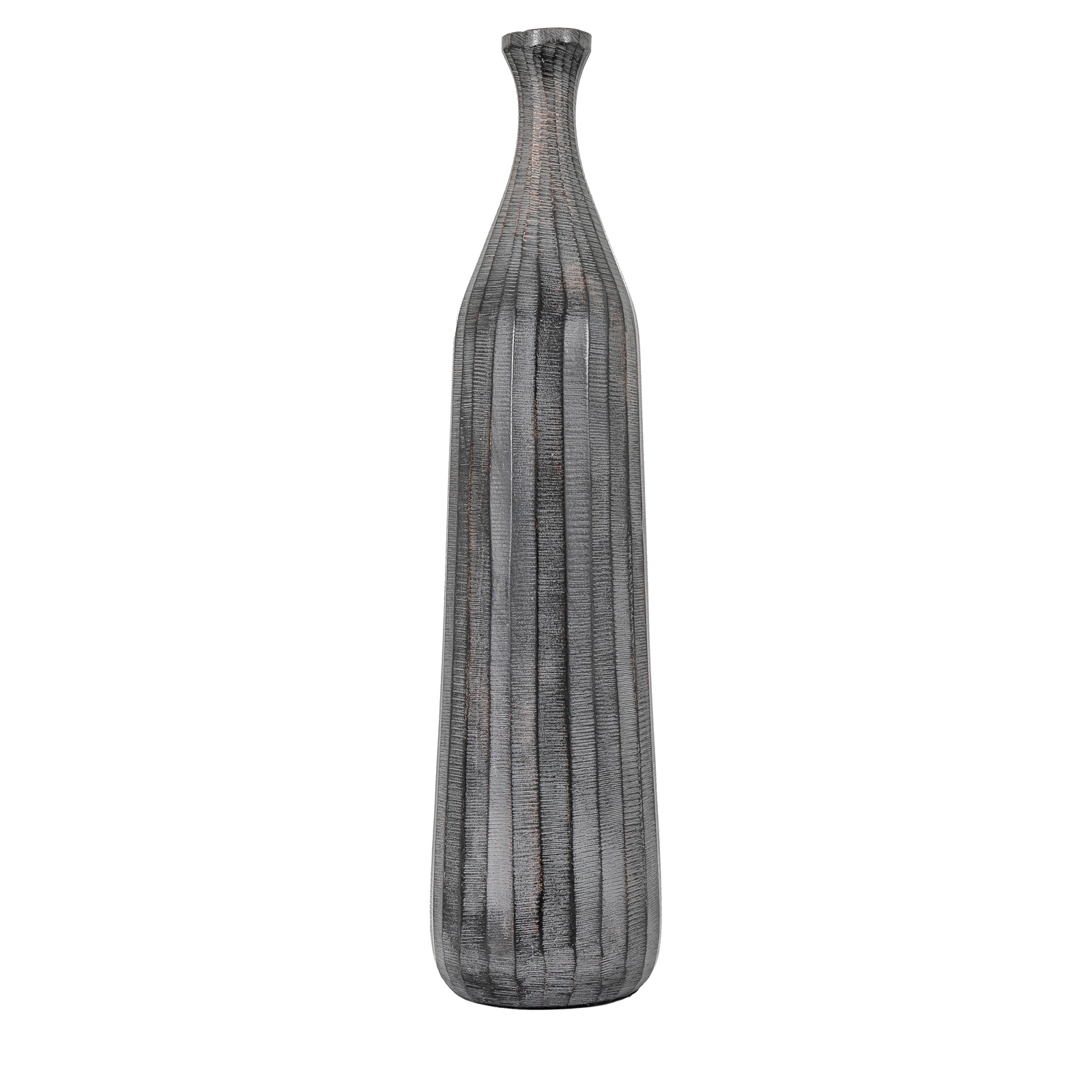 Dzięki wysokiemu i eleganckiemu kształtowi oraz ciemnoszarym liniowym wzorom ten wazon butelkowy stanowi efektowny element wystroju. Umieść go wraz z dopasowanymi wazonami, aby stworzyć jeszcze bardziej przyciągającą wzrok kompozycję.