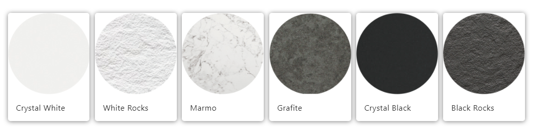 c) Dowolny (+40% ceny): Dowolny kolor z palety RAL. - Blaty – Bez wątpienia wykorzystanie blatów kompaktowych slim w naszych szafkach to zupełna nowość na rynku. Dotychczas to rozwiązanie było charakterystyczne dla aranżacji kuchennych. Wybierz jeden z blatów i dopasuj go do Wooden! Do wyboru: Bianco Nero, White Rocks, Marmo, Grafite, Colmena, Black Rocks, Dąb Naturalny
