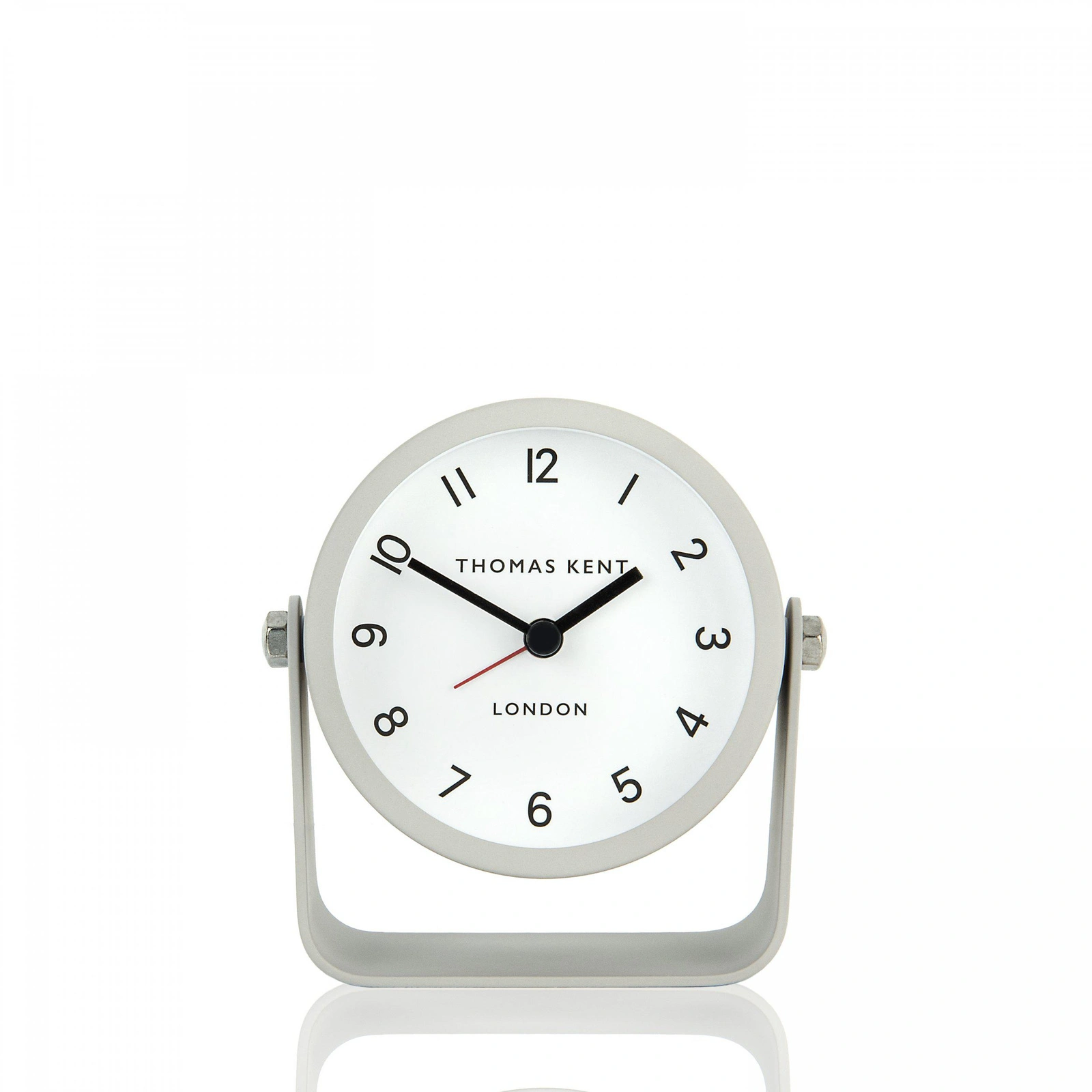 A cute contemporary alarm clock boasts a Nordic style. Clean, simple curves hold together the neat design. A metal stand and frame present a muted dove grey hue with a matt finish. The simple dial detailing contemporary black numerals, and a contrasting red alarm hand complete the clock's aesthetics. The Wren holds a silent movement.