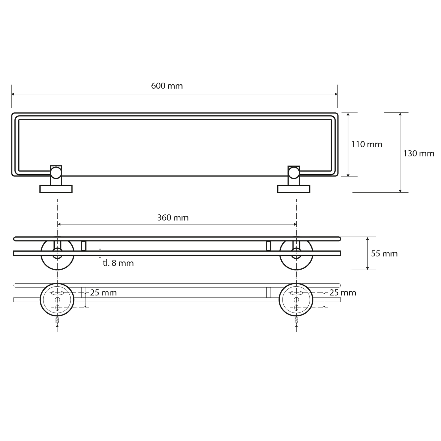 X-ROUND E półka szklana ze składanym drążkiem 600x130mm, szkło mleczne, chrom