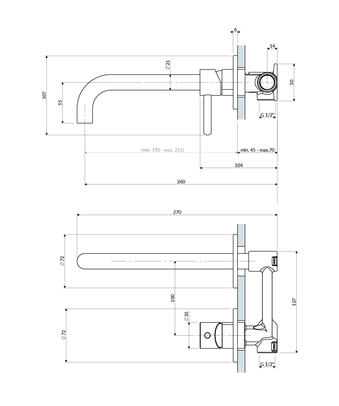 - zasięg wylewki od powierzchni płytek: 19-21,5 cm (zależny od głębokości montażu baterii w ścianie)