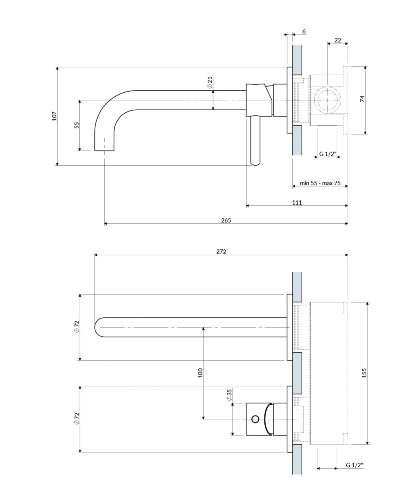 - zasięg wylewki od powierzchni płytek: 19-21,5 cm (zależny od głębokości montażu baterii w ścianie)