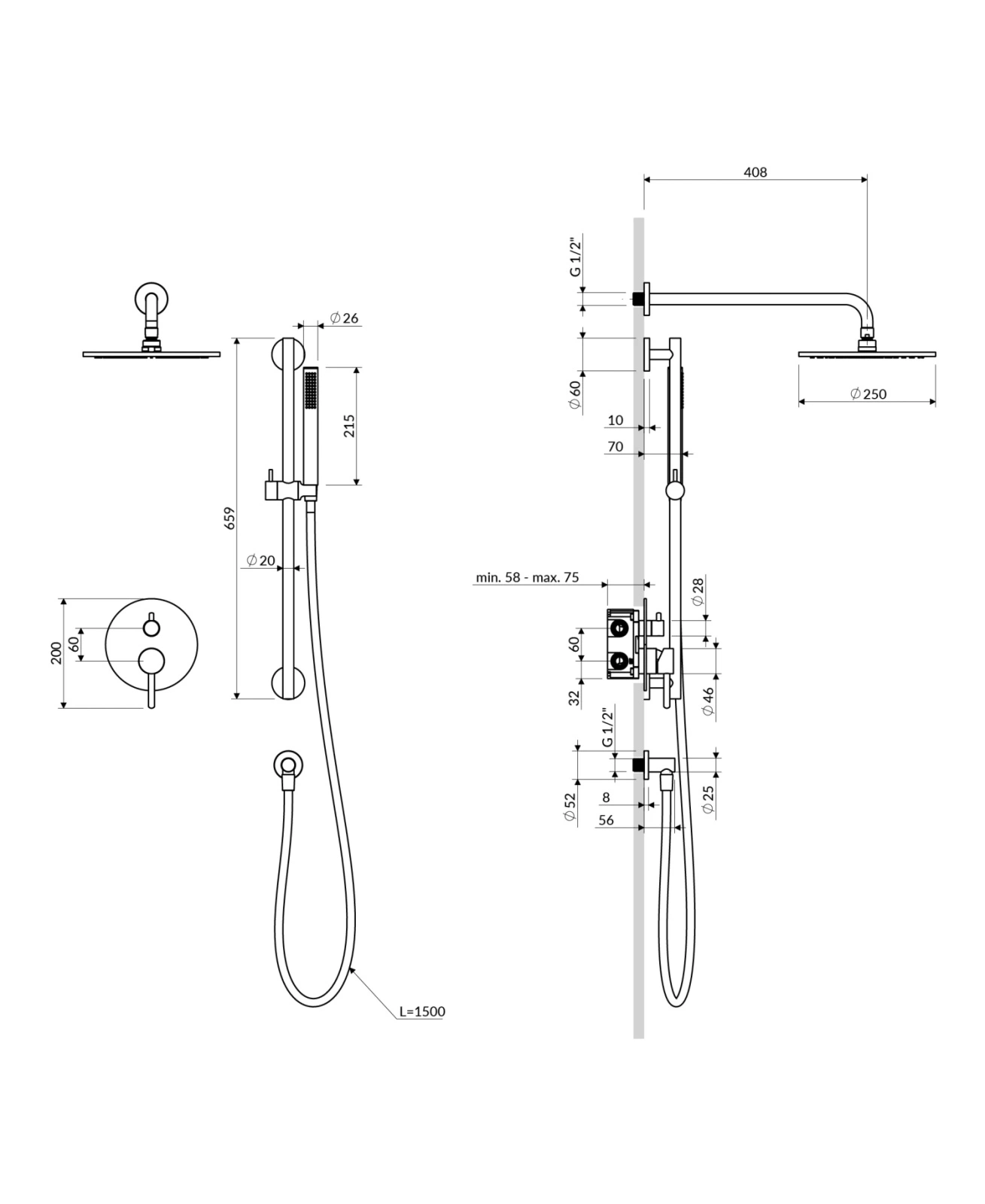 - deszczownica z ramieniem (WGSET1CP), mosiężna, rozmiar: ø25 cm, zasięg od ściany: 41 cm