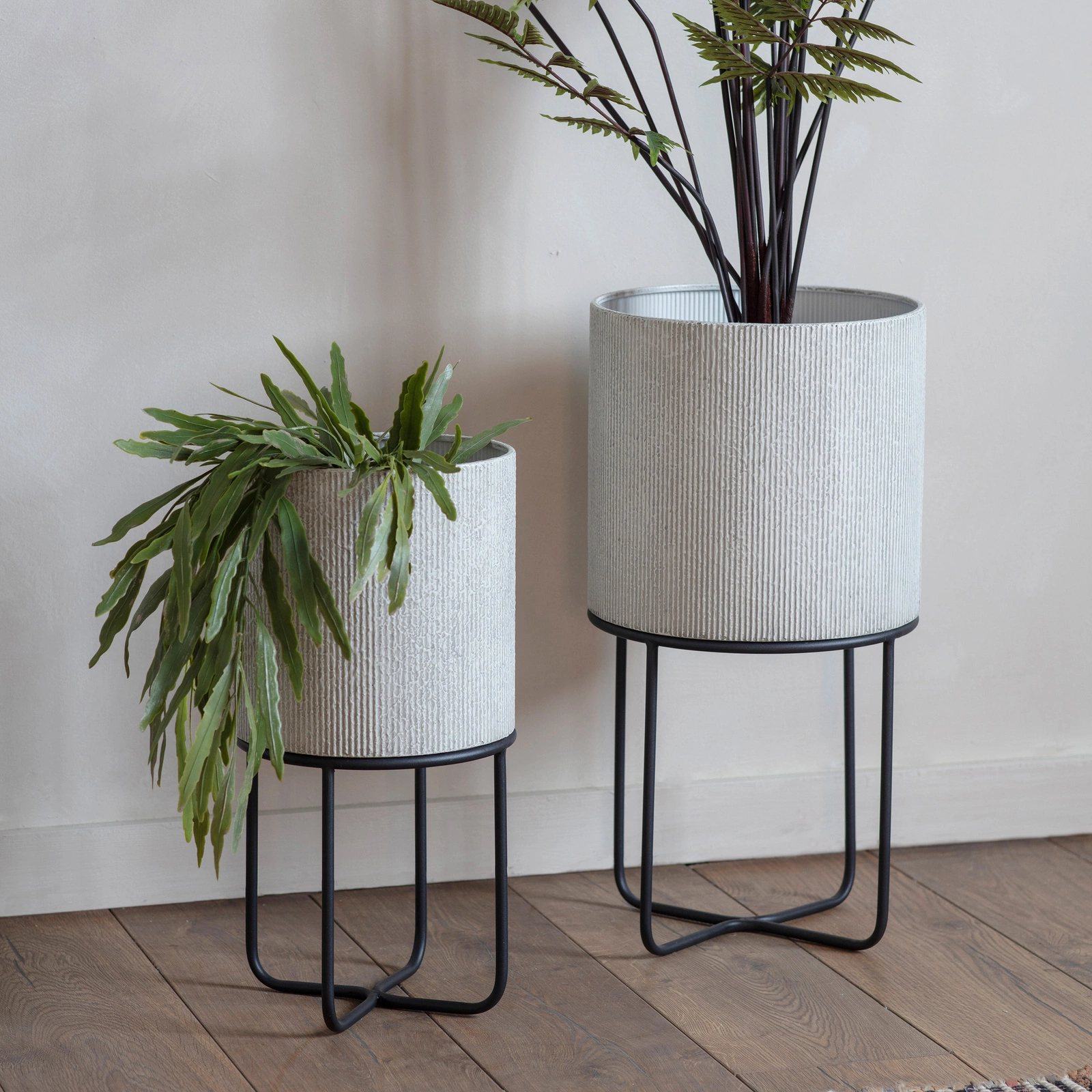 Te metalowe donice mają nowoczesny design, a ich cylindryczny kształt wsparty jest na czarnym metalowym stojaku. Dostępne również w szarym wykończeniu.