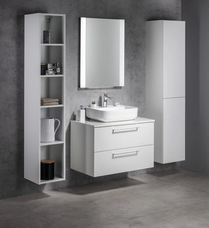 Dużym atutem jest możliwość zamówienia praktycznych organizerów LINDO oraz pojemników do przechowywania drobnych przedmiotów codziennego użytku w górnej i dolnej szufladzie. Szuflady wyposażone są w pojazdy z cichym domykiem, drzwiczki posiadają zawiasy zwalniające. Szafki umywalkowe CIRASA dobrze się komponują z uniwersalnymi słupkami o dodatkowymi szafkami z serii ESPACE