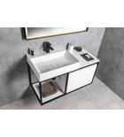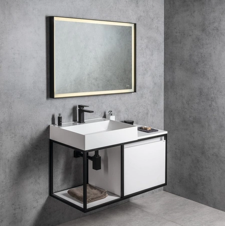 Profile konstrukcji wykonane są w kolorze czarny mat, dodatkowa szuflada wykonana jest z płyt MDF laminowanych w dekorze dąb Collingwood albo dąb Alabama. Szuflada nie ma uchwytów, co podkreśla prosty design i wyposażona jest w system Soft close do automatycznego zamykania szuflady. Konstrukcje podwieszane przeznaczone są do umywalek kompozytowych TWIG w kolorze białym. Konstrukcje o szerokości 80 i 100 cm są asymetryczne z praktycznym miejscem do przechowywania rzeczy. Oferujemy również wariant konstrukcji stojącej pod umywalką betonową FORMIGO, którą oferujemy w kilku dekorach.
