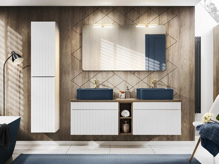 Zestaw meblowy 140cm z blatem, 2 umywalkami nablatowymi Kama, szafką wysoką i lustrem