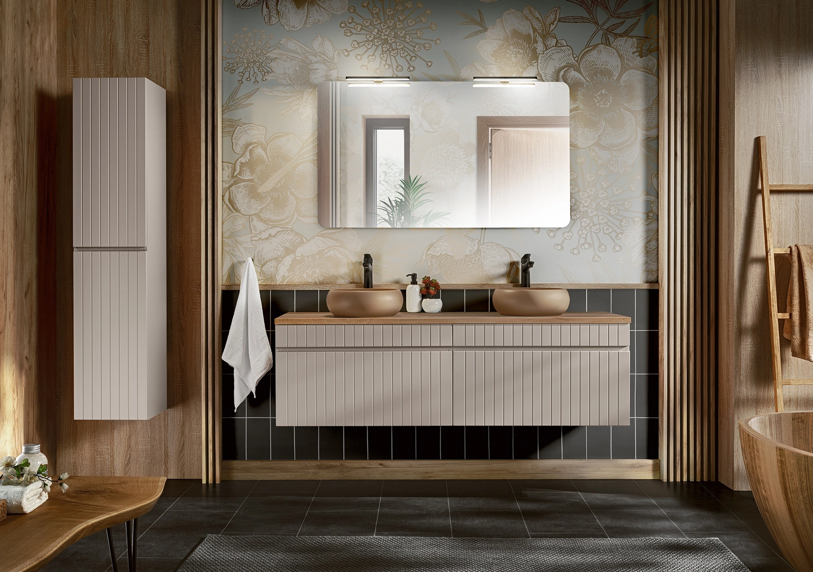 Zestaw meblowy 160cm z blatem, 2 umywalkami nablatowymi Wiki, szafką wysoką i lustrem