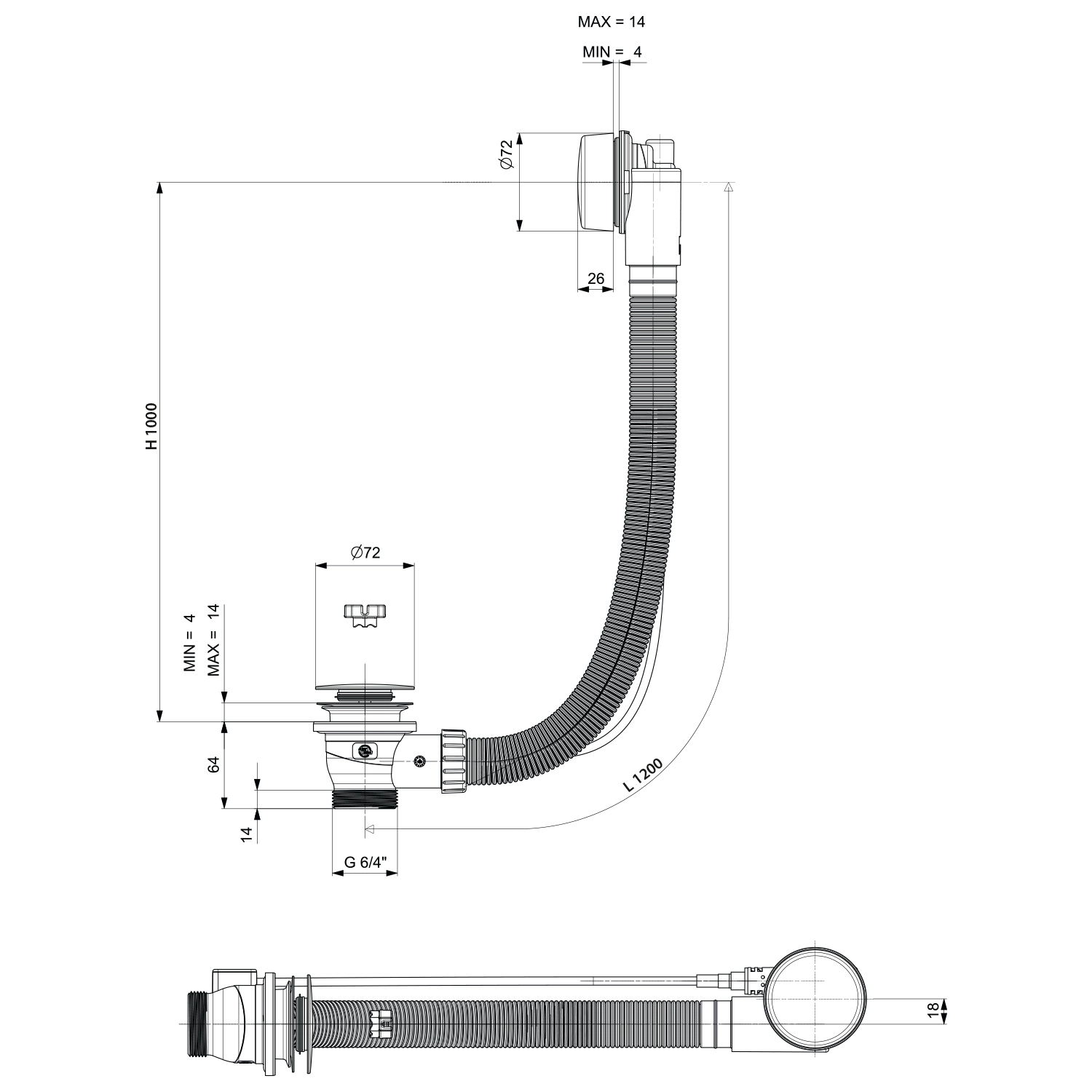 Zestaw odpływowy z korkiem automatycznym, długość 1200mm, korek 72mm, czarny mat