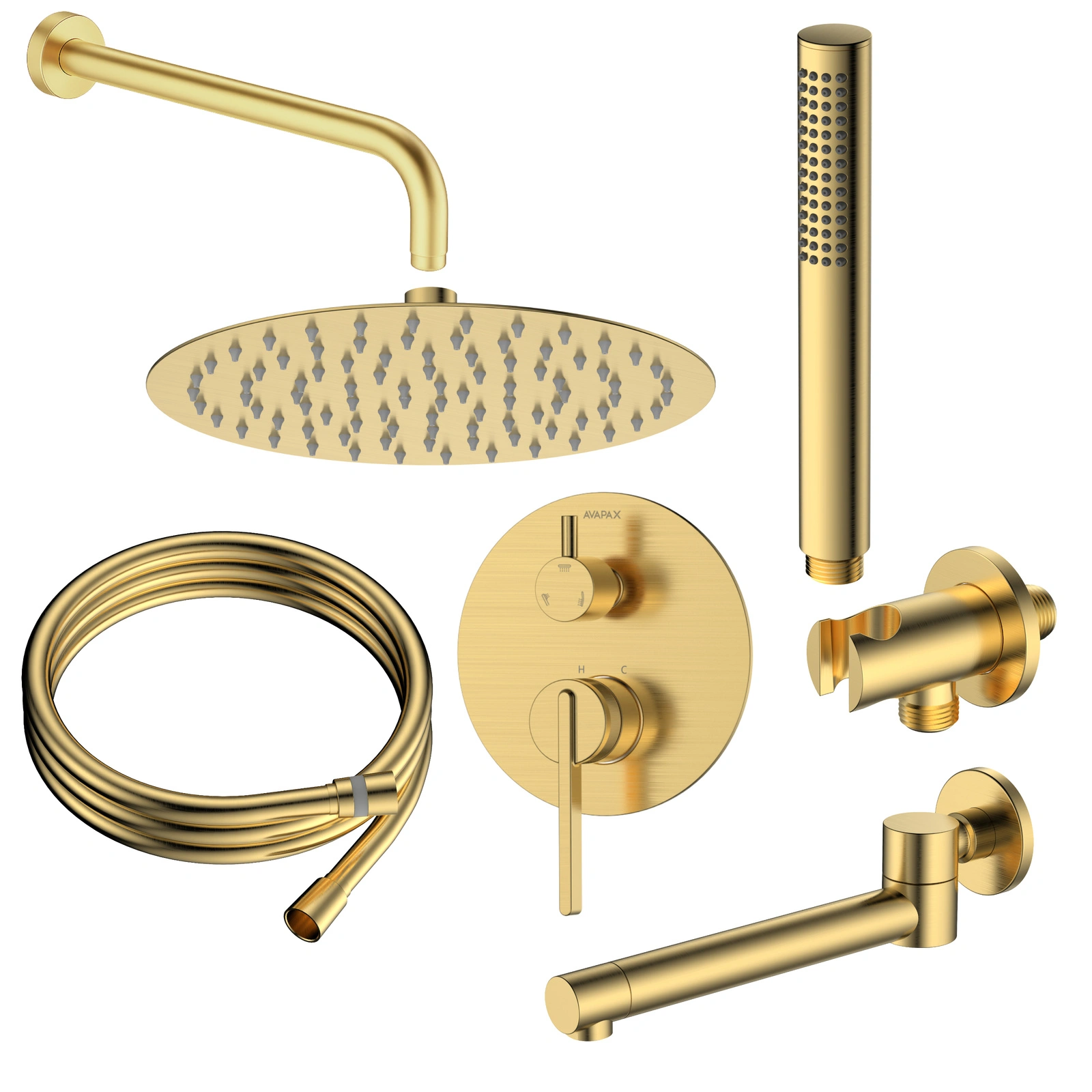 • Avapax AUREVO, Zestaw prysznicowy podtynkowy trzyfunkcyjny, symbol produktu ANAU131221, w kolorze złotym szczotkowanym.