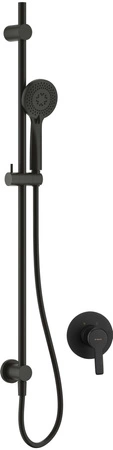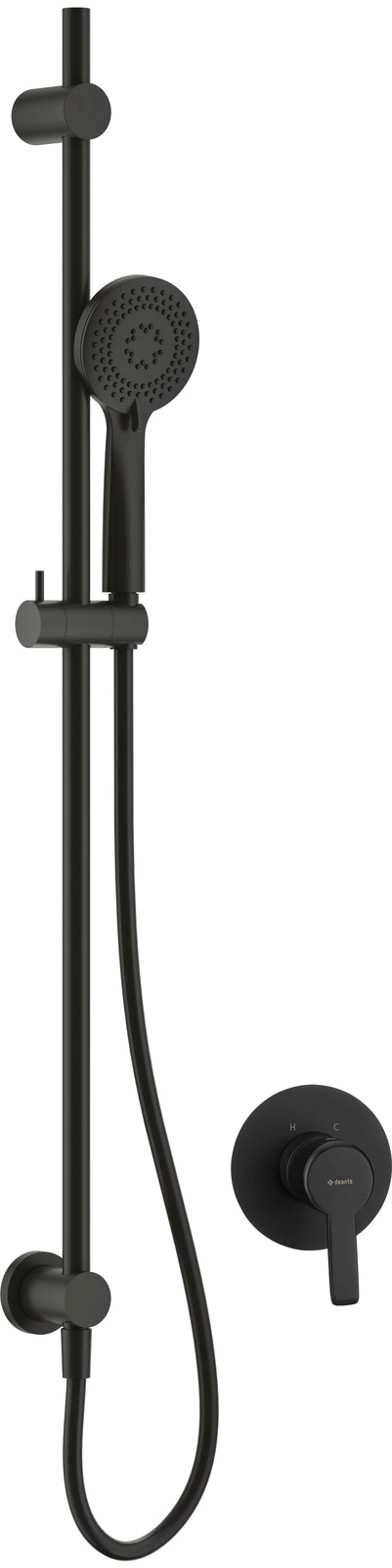 W skład zestawu podtynkowego Arnika wchodzi słuchawka prysznicowa z wężem, umocowana na stylowym drążku oraz bateria podtynkowa. Mosiężny uchwyt słuchawki można przesuwać do dowolnej pozycji. Jednouchwytowa bateria posiada wygodną dźwignię oraz ceramiczną głowicę. Całość wykończona jest w eleganckiej, matowej czerni. Właściwości