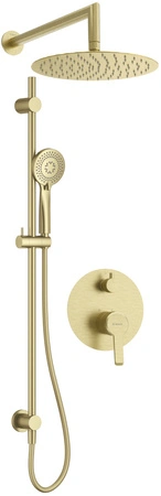 Komplet podtynkowy Arnika oferuje wyjątkową funkcjonalność i estetykę. Składa się z: zestawu natryskowego z przyłączem podtynkowym, podtynkowej baterii oraz wylewki i głowicy natryskowej. W skład natryskowego zestawu wchodzi słuchawka prysznicowa z wężem, umocowana na eleganckim drążku. Mosiężny uchwyt słuchawki jest regulowany, co pozwala na dostosowanie jej pozycji do indywidualnych potrzeb. Słuchawka oferuje trzy funkcje strumienia: deszczowy, hydromasaż i mieszany. System Anti-calc ułatwia utrzymanie jej w czystości, zapobiegając osadzaniu się kamienia. Podtynkowa bateria natryskowa z kolekcji Arnika to kwintesencja nowoczesności i elegancji. Posiada prostą dźwignię oraz mechaniczny przełącznik natrysku, umożliwiający łatwe przełączanie między deszczownicą a słuchawką prysznicową nawet przy małym strumieniu. Stalowa głowica z systemem Anti - calc posiada przyjemny deszczowy strumień. Komplet podtynkowy Arnika to harmonijne połączenie nowoczesnego designu, funkcjonalności i trwałości. Wykończony w szczotkowanym złocie idealnie komponuje się z trendami w aranżacjach premium.Właściwości
