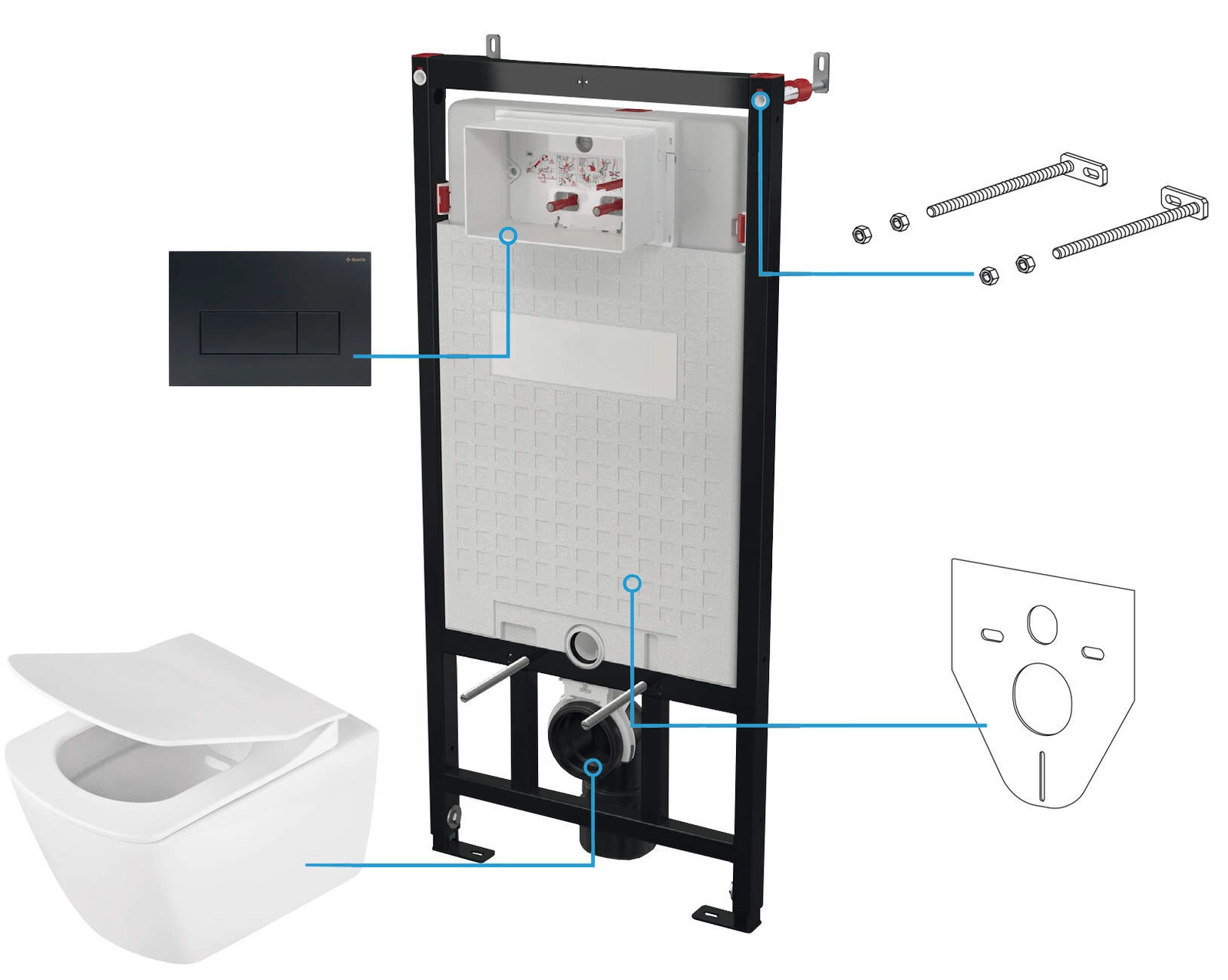 Kompletny, przeznaczony do montażu podtynkowego zestaw 6w1 z miską WC bezkołnierzową wiszącą z kolekcji Blur, pozwoli Ci w szybki i łatwy w montażu sposób, zaaranżować nowoczesną, estetyczną i wygodną do utrzymania w czystości toaletę. Geometryczna kolekcja Blur idealnie sprawdzi się w łazienkach urządzonych w minimalistycznym stylu, w tym także tych o niewielkim metrażu. Ceramiczna, podwieszana miska WC z cicho opadającą, cienką deską Slim, charakteryzuje się brakiem standardowego kołnierza bez trudnych do utrzymania w czystości kątów, rantów i zakamarków. Design miski nie tylko skraca czas czyszczenia toalety i ilość wykorzystywanych do tego detergentów, ale także sprawia, że do spłukania muszli potrzeba mniej wody, co zmniejsza jej zużycie i jest zgodne z filozofią Proeco marki Deante. Miskę montuje się na ścianie za pomocą znajdującego się w zestawie stelaża podtynkowego.
