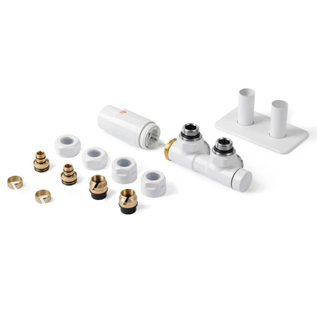 Zestaw zaworów Twins kątowy lewy Biały to zestaw akcesoriów współpracujących z grzejnikami o wysokiej jakości. Jest to urządzenie, które zapewnia nie tylko prosty montaż, ale także trwałość. Ten zestaw zaworów wyróżnia się eleganckim, białym wykończeniem, które nadaje mu połyskujący wygląd. Zawór trójosiowy podwójny termostat to zawór, który pełni kluczową funkcję w regulacji temperatury wody, która przepływa przez grzejnik.