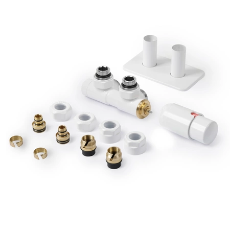 W skład zestawu wchodzą nie tylko zawory, ale także kompletny zestaw akcesoriów niezbędnych do instalacji. Obejmuje to głowicę termostatyczną, zestaw maskujący, dwa adaptery PEX oraz dwa adaptery CU. Dzięki tym akcesoriom proces montażu będzie szybki i prosty.  Zestaw zaworów grzejnikowych Twins to doskonały wybór dla osób poszukujących wysokiej jakości akcesoriów do swojego systemu grzewczego.