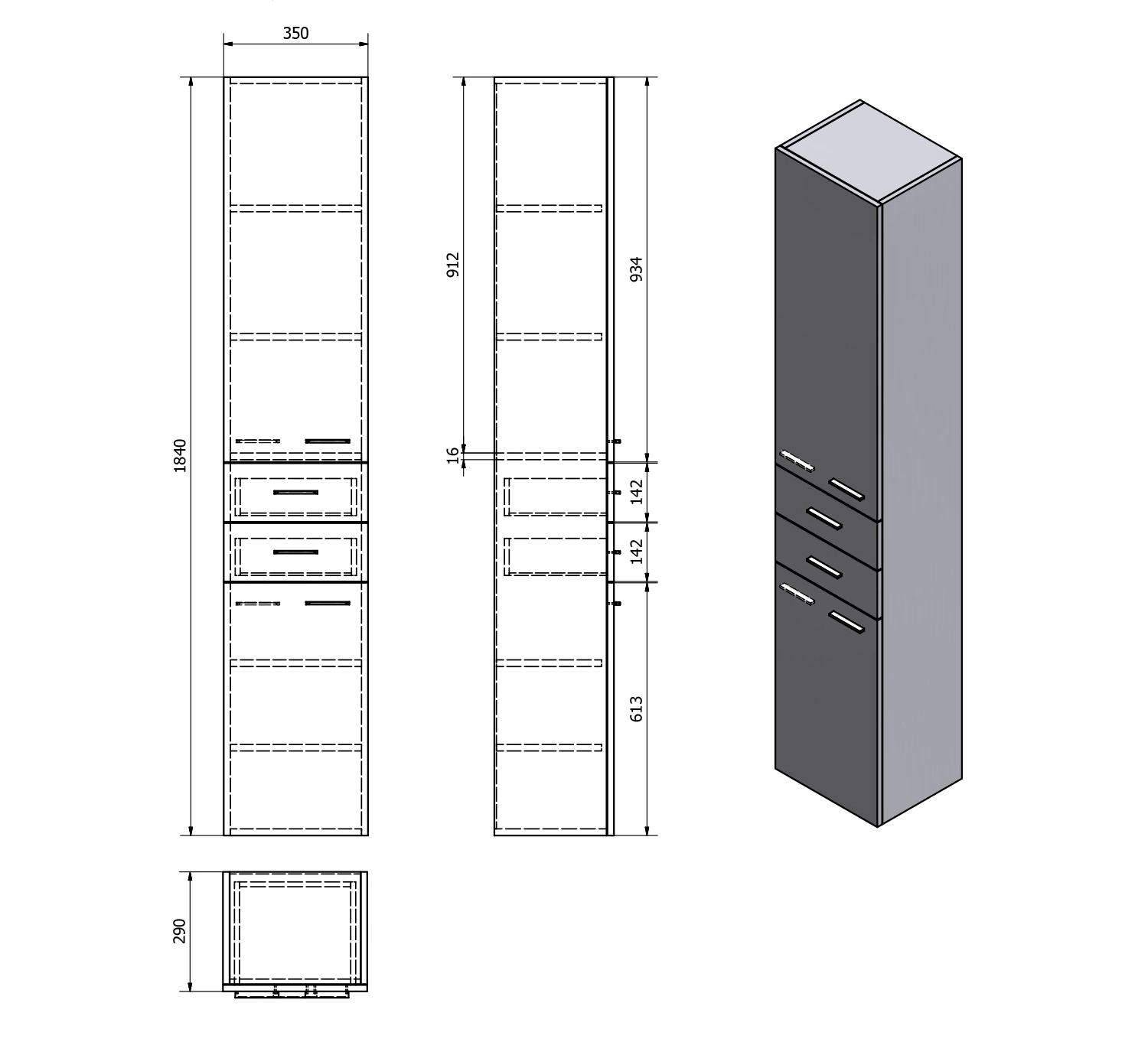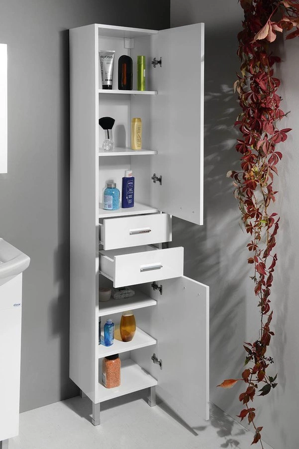 Nowoczesny design umywalek doskonale harmonizuje z prostymi krawędziami szafek, a płaskie uchwyty w chromowanym wykończeniu nadają im ponadczasowy styl. Szafki pod umywalkę można montować na zawiasach, a niektóre modele można dodatkowo wyposażyć w nóżki, co ułatwia instalację. Kolekcja dostępna jest w dwóch praktycznych wersjach wykończenia: biały połysk oraz jasny dąb platin.