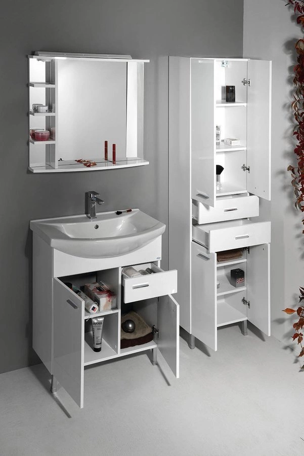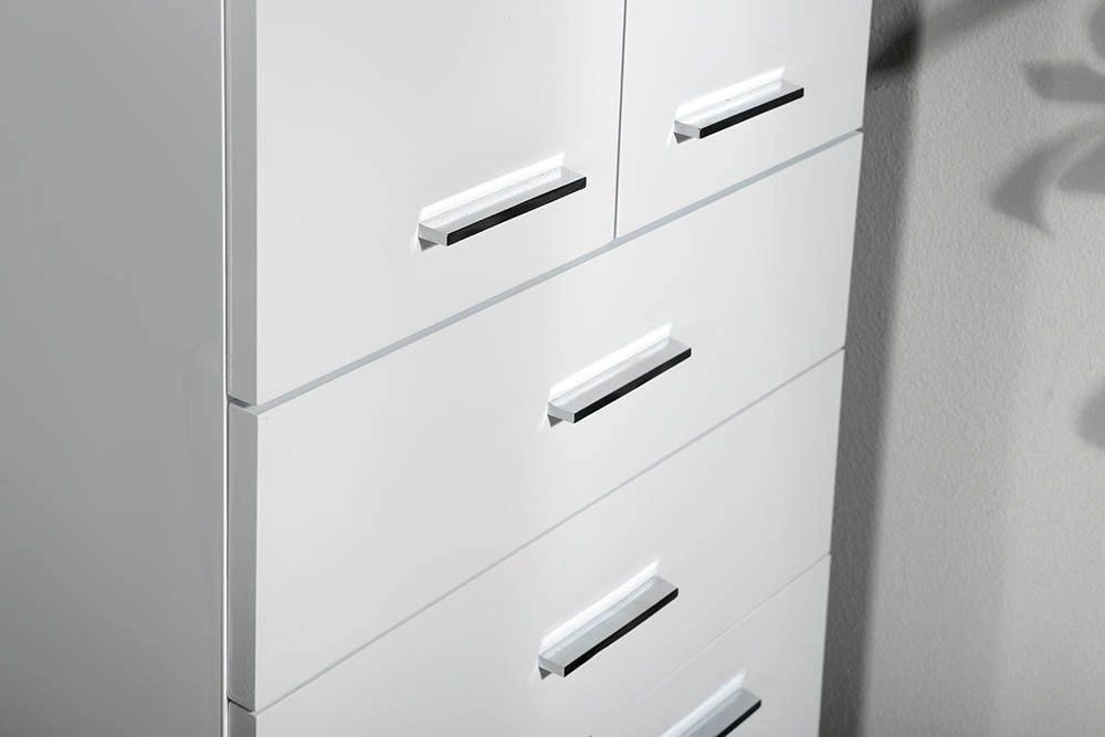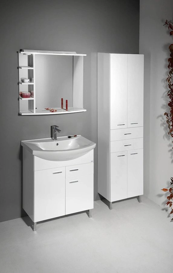 Nowoczesny design umywalek doskonale harmonizuje z prostymi krawędziami szafek, a płaskie uchwyty w chromowanym wykończeniu nadają im ponadczasowy styl. Szafki pod umywalkę można montować na zawiasach, a niektóre modele można dodatkowo wyposażyć w nóżki, co ułatwia instalację. Kolekcja dostępna jest w dwóch praktycznych wersjach wykończenia: biały połysk oraz jasny dąb platin.