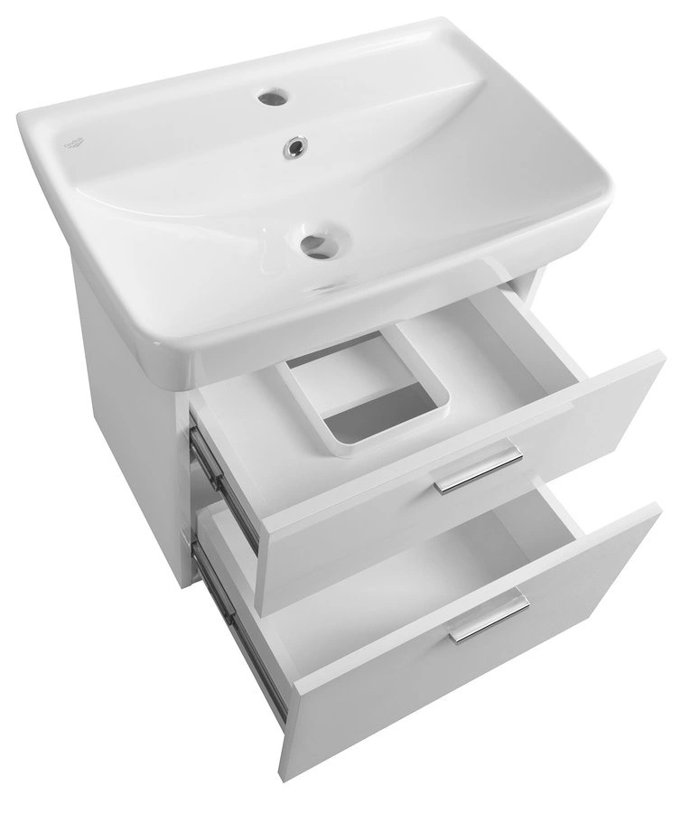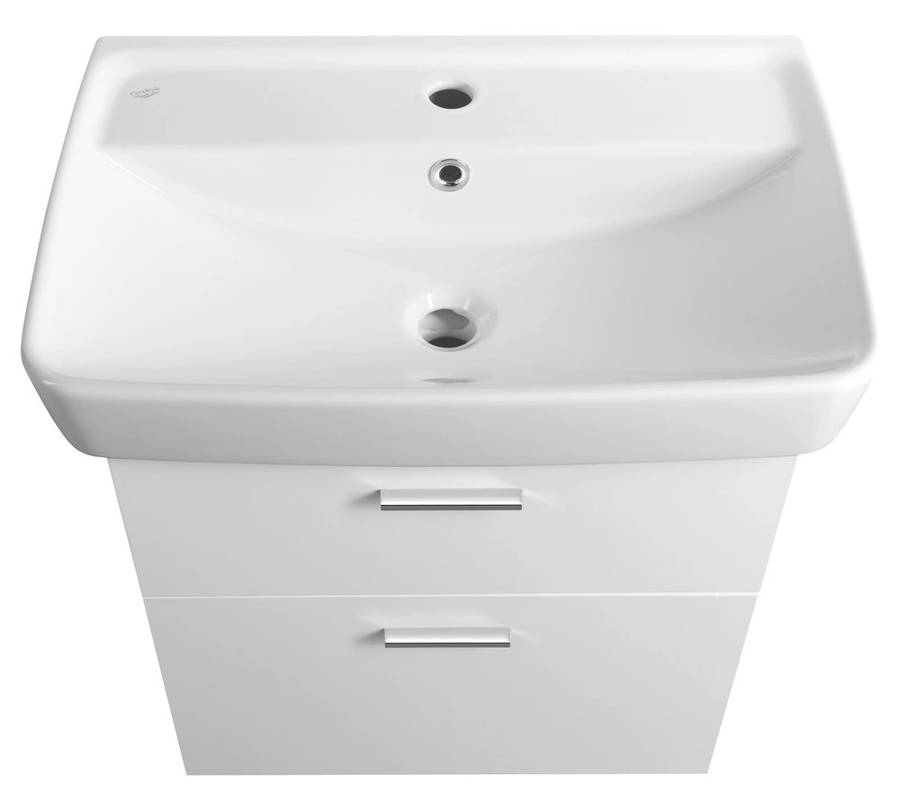 Nowoczesny design umywalek doskonale harmonizuje z prostymi krawędziami szafek, a płaskie uchwyty w chromowanym wykończeniu nadają im ponadczasowy styl. Szafki pod umywalkę można montować na zawiasach, a niektóre modele można dodatkowo wyposażyć w nóżki, co ułatwia instalację. Kolekcja dostępna jest w dwóch praktycznych wersjach wykończenia: biały połysk oraz jasny dąb platin.