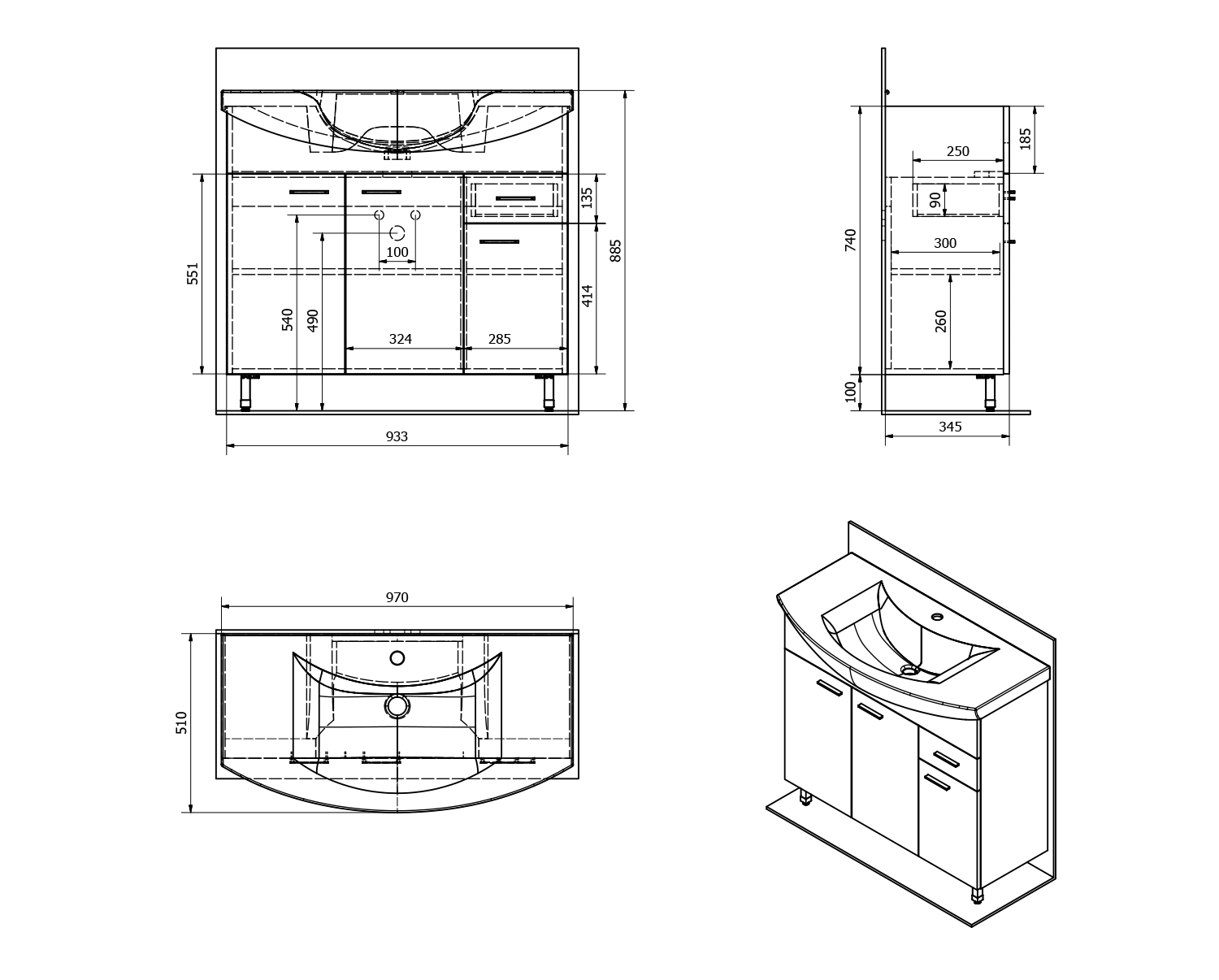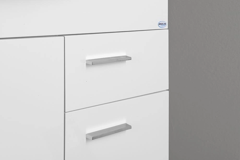 Nowoczesny design umywalek doskonale harmonizuje z prostymi krawędziami szafek, a płaskie uchwyty w chromowanym wykończeniu nadają im ponadczasowy styl. Szafki pod umywalkę można montować na zawiasach, a niektóre modele można dodatkowo wyposażyć w nóżki, co ułatwia instalację. Kolekcja dostępna jest w dwóch praktycznych wersjach wykończenia: biały połysk oraz jasny dąb platin.
