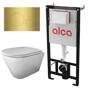 RAK Ceramics RESORT Miska WC podwiesz. Rimless 52x36 cm biały połysk ze stelażem i przyciskiem Przycisk THIN Złoty Połysk Alcadrain